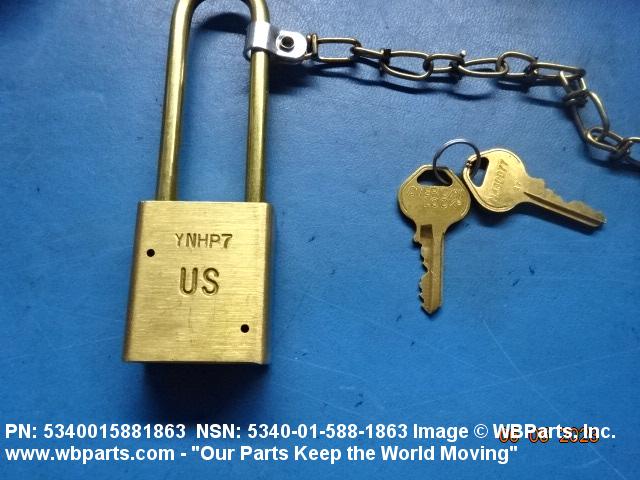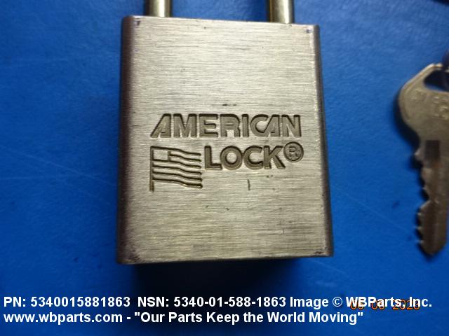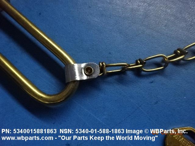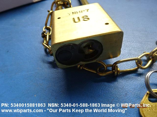 5340-01-588-1863 A detachable portable fastening device, having a shackle or bow adapted to be opened for engagement through a staple or the link of a chain. The bow or shackle, when locked, is secured in the case by means of a spring-activated pin(s) entering a notch(es) in the shackle. The lock may be opened by inserting and turning a key or keys, by key insertion only, or by a predetermined setting on the dial of a combination lock. For two or more padlocks which are keyed alike and/or master keyed, see PADLOCK SET.