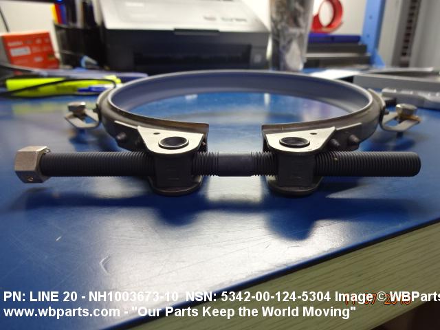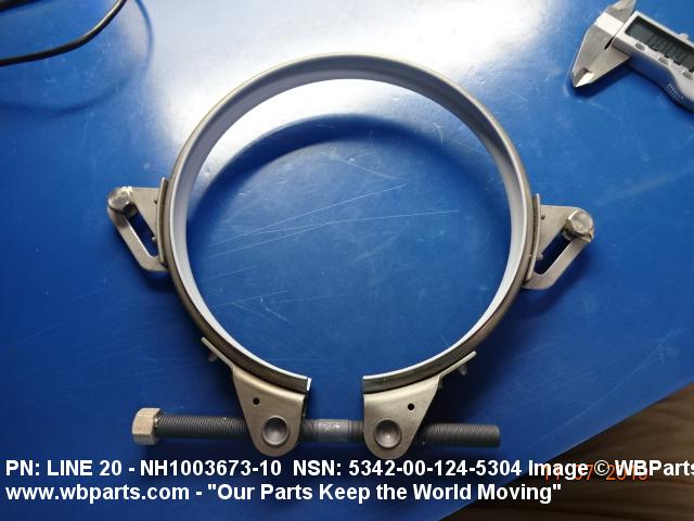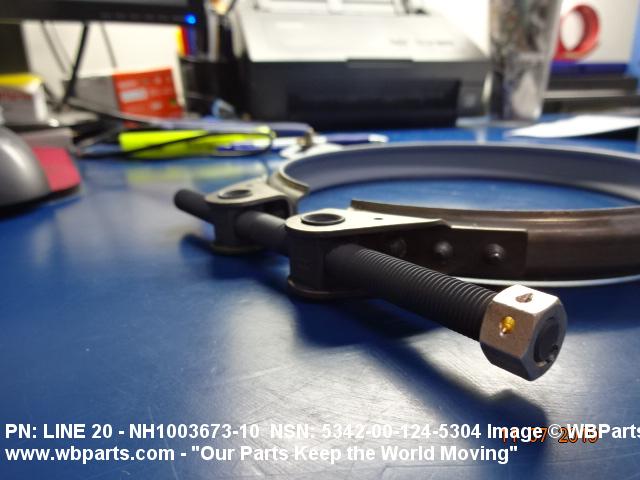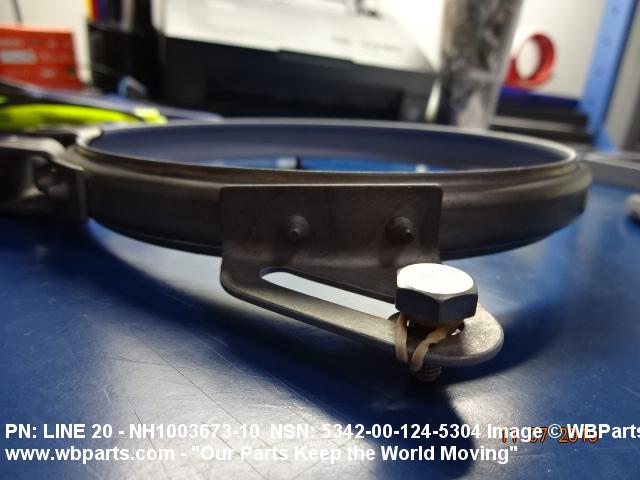5342-00-124-5304 A metal loop having either a V or U cross section or channelled segment(s). It may be attached to a flat band. It is designed to create a fluid tight joint and/or connect pipe, tubing, tank cover(s), duct(s) and the like, by mating with flanged or beaded ferrule(s), flared, or beaded ends. It may or may not have a sealing inner liner. A latch or latches of the quick coupling type, nut or bolt type, or threaded trunnion type is (are) used to lock and adjust the band. Excludes COUPLING, CLAMP, PIPE and RING, LOCKING, METAL DRUM COVER.