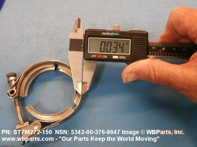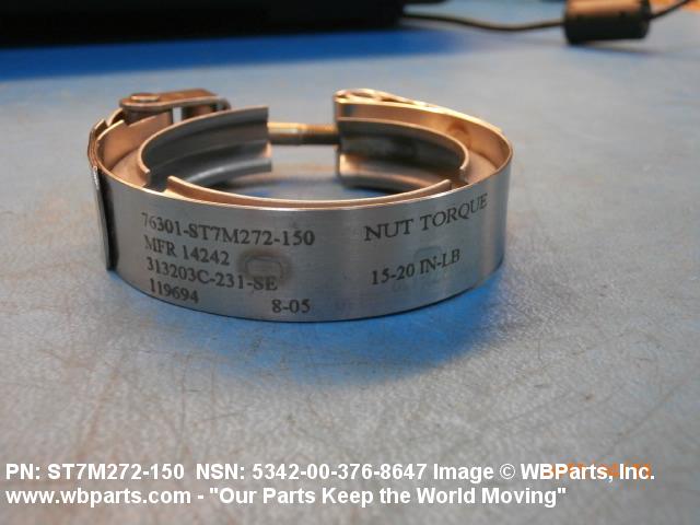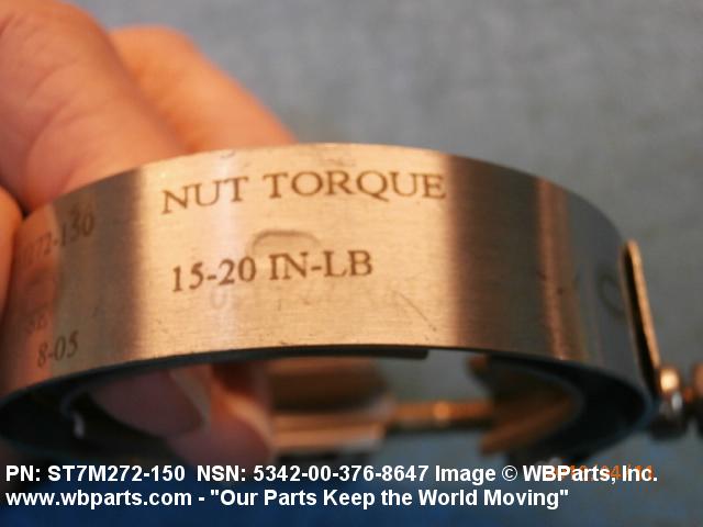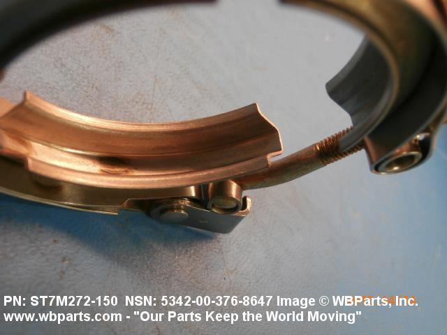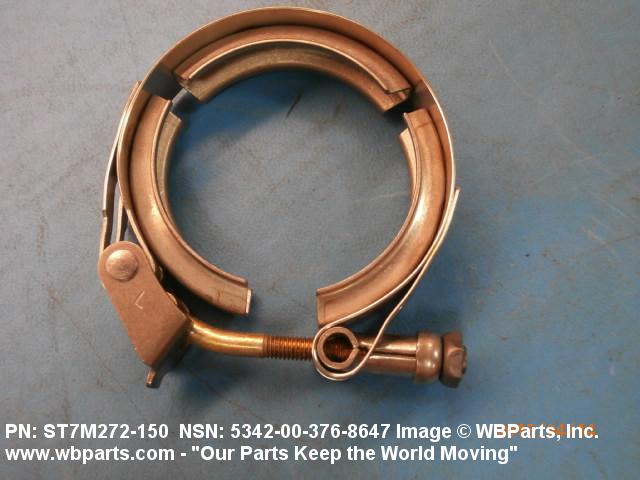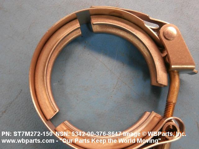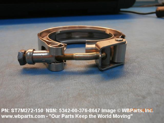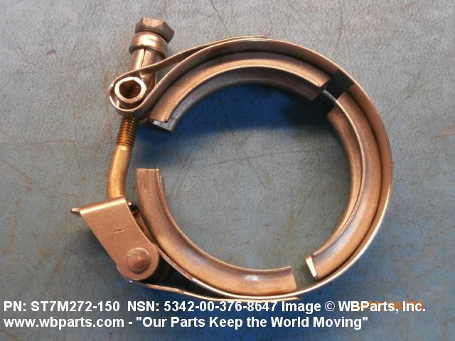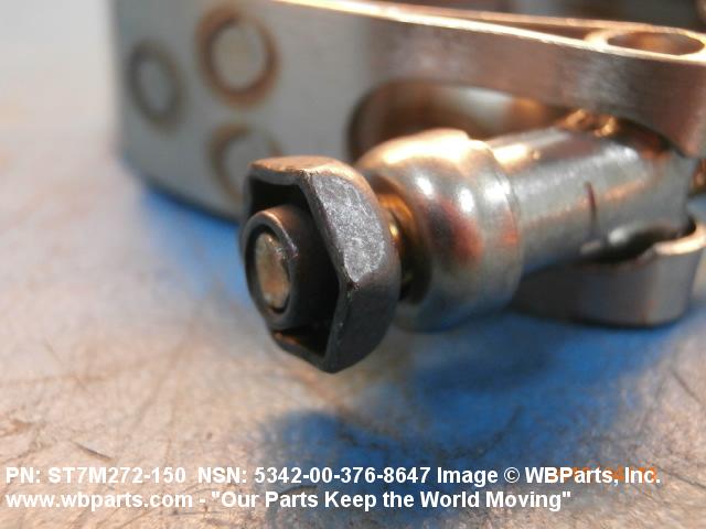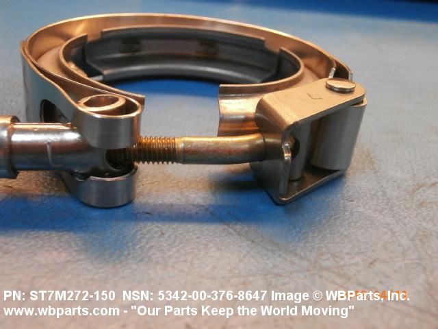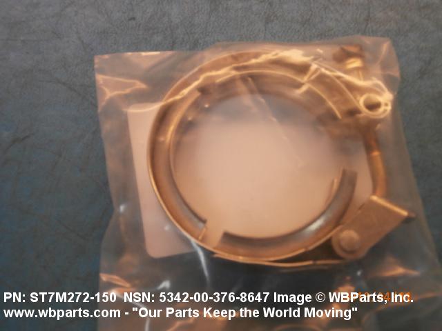 5342-00-376-8647 A metal loop having either a V or U cross section or channelled segment(s). It may be attached to a flat band. It is designed to create a fluid tight joint and/or connect pipe, tubing, tank cover(s), duct(s) and the like, by mating with flanged or beaded ferrule(s), flared, or beaded ends. It may or may not have a sealing inner liner. A latch or latches of the quick coupling type, nut or bolt type, or threaded trunnion type is (are) used to lock and adjust the band. Excludes COUPLING, CLAMP, PIPE and RING, LOCKING, METAL DRUM COVER.