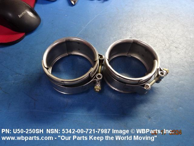 5342-00-721-7987 A metal loop having either a V or U cross section or channelled segment(s). It may be attached to a flat band. It is designed to create a fluid tight joint and/or connect pipe, tubing, tank cover(s), duct(s) and the like, by mating with flanged or beaded ferrule(s), flared, or beaded ends. It may or may not have a sealing inner liner. A latch or latches of the quick coupling type, nut or bolt type, or threaded trunnion type is (are) used to lock and adjust the band. Excludes COUPLING, CLAMP, PIPE and RING, LOCKING, METAL DRUM COVER.