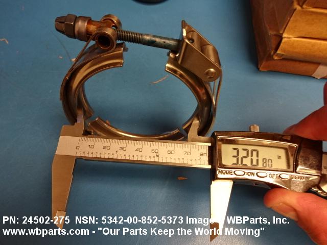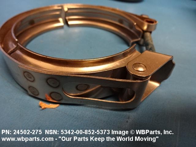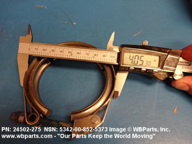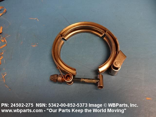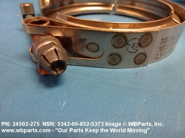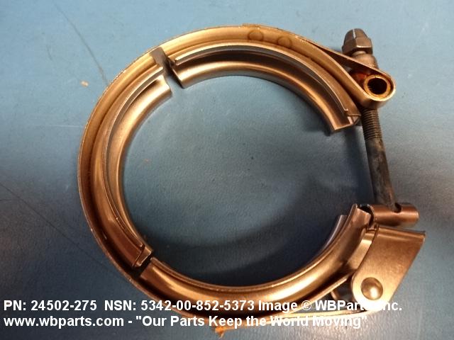 5342-00-852-5373 A metal loop having either a V or U cross section or channelled segment(s). It may be attached to a flat band. It is designed to create a fluid tight joint and/or connect pipe, tubing, tank cover(s), duct(s) and the like, by mating with flanged or beaded ferrule(s), flared, or beaded ends. It may or may not have a sealing inner liner. A latch or latches of the quick coupling type, nut or bolt type, or threaded trunnion type is (are) used to lock and adjust the band. Excludes COUPLING, CLAMP, PIPE and RING, LOCKING, METAL DRUM COVER.