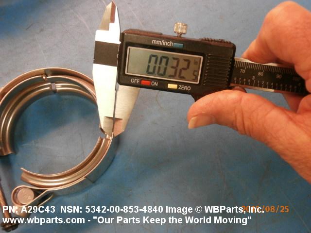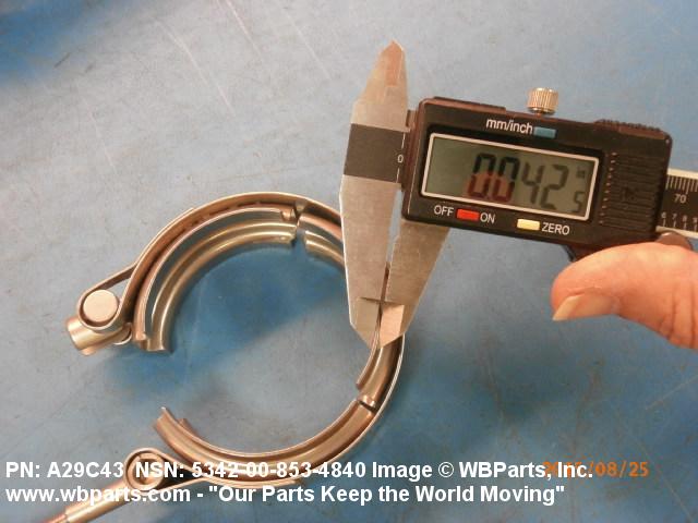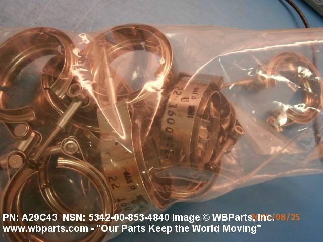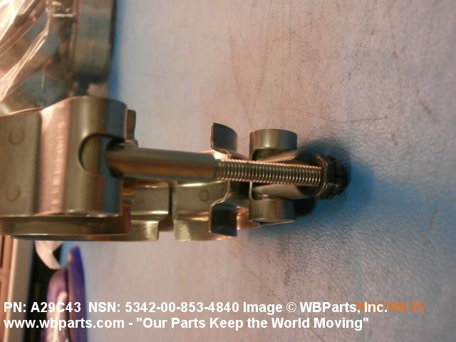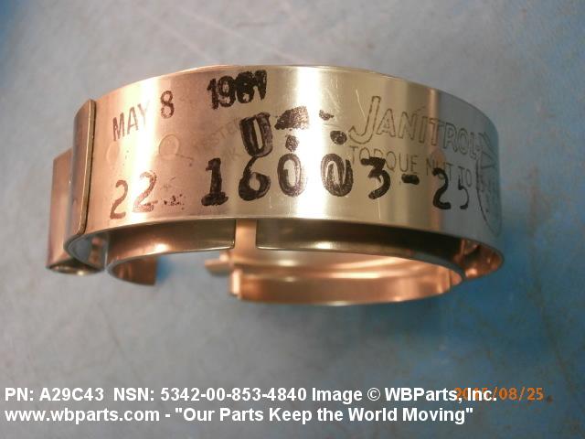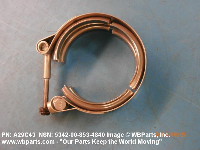 5342-00-853-4840 A metal loop having either a V or U cross section or channelled segment(s). It may be attached to a flat band. It is designed to create a fluid tight joint and/or connect pipe, tubing, tank cover(s), duct(s) and the like, by mating with flanged or beaded ferrule(s), flared, or beaded ends. It may or may not have a sealing inner liner. A latch or latches of the quick coupling type, nut or bolt type, or threaded trunnion type is (are) used to lock and adjust the band. Excludes COUPLING, CLAMP, PIPE and RING, LOCKING, METAL DRUM COVER.