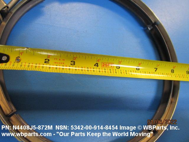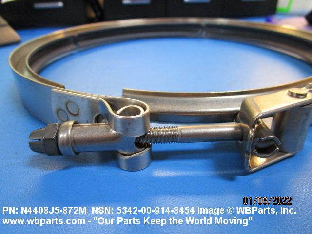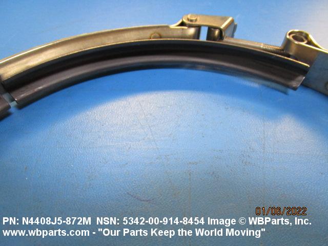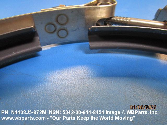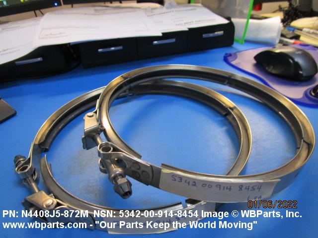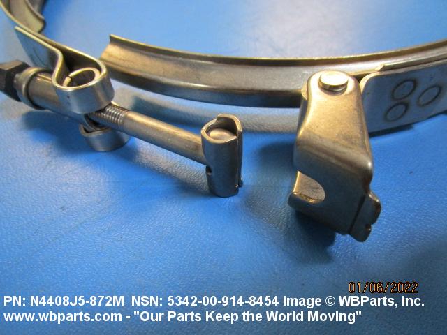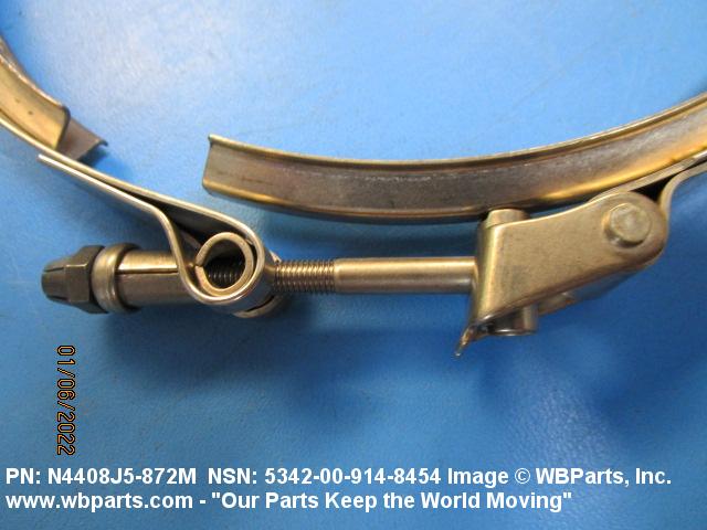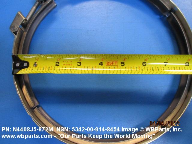 5342-00-914-8454 A metal loop having either a V or U cross section or channelled segment(s). It may be attached to a flat band. It is designed to create a fluid tight joint and/or connect pipe, tubing, tank cover(s), duct(s) and the like, by mating with flanged or beaded ferrule(s), flared, or beaded ends. It may or may not have a sealing inner liner. A latch or latches of the quick coupling type, nut or bolt type, or threaded trunnion type is (are) used to lock and adjust the band. Excludes COUPLING, CLAMP, PIPE and RING, LOCKING, METAL DRUM COVER.
