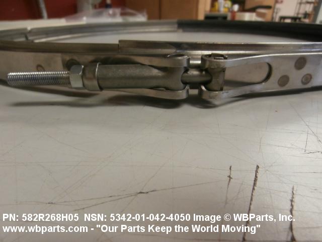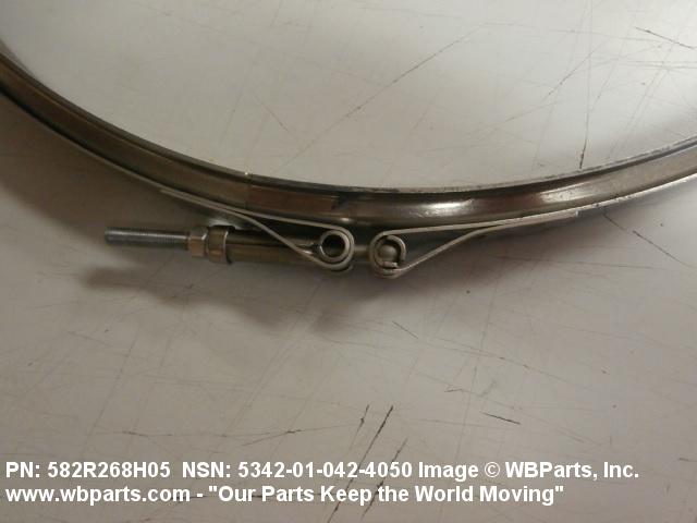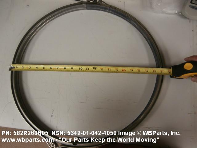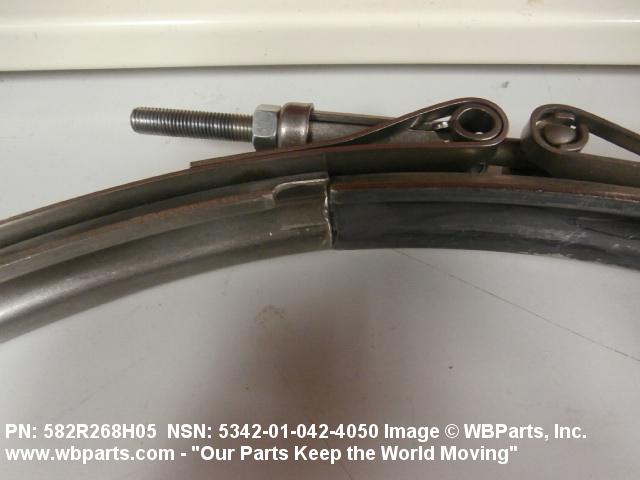 5342-01-042-4050 A metal loop having either a V or U cross section or channelled segment(s). It may be attached to a flat band. It is designed to create a fluid tight joint and/or connect pipe, tubing, tank cover(s), duct(s) and the like, by mating with flanged or beaded ferrule(s), flared, or beaded ends. It may or may not have a sealing inner liner. A latch or latches of the quick coupling type, nut or bolt type, or threaded trunnion type is (are) used to lock and adjust the band. Excludes COUPLING, CLAMP, PIPE and RING, LOCKING, METAL DRUM COVER.