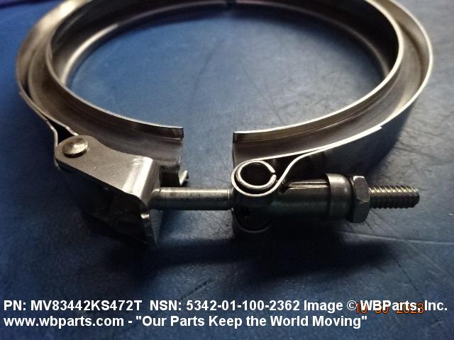 5342-01-100-2362 A metal loop having either a V or U cross section or channelled segment(s). It may be attached to a flat band. It is designed to create a fluid tight joint and/or connect pipe, tubing, tank cover(s), duct(s) and the like, by mating with flanged or beaded ferrule(s), flared, or beaded ends. It may or may not have a sealing inner liner. A latch or latches of the quick coupling type, nut or bolt type, or threaded trunnion type is (are) used to lock and adjust the band. Excludes COUPLING, CLAMP, PIPE and RING, LOCKING, METAL DRUM COVER.