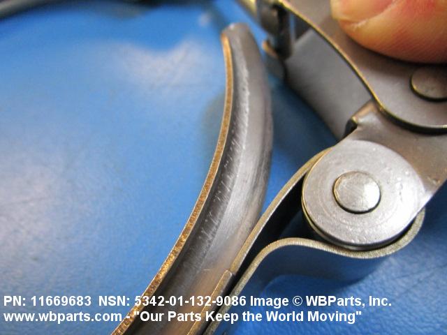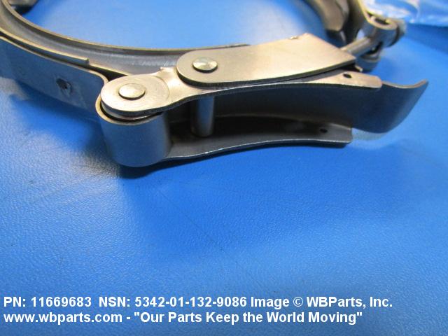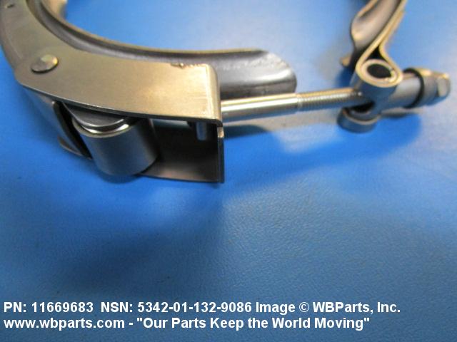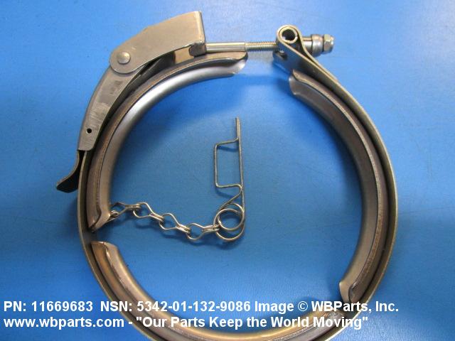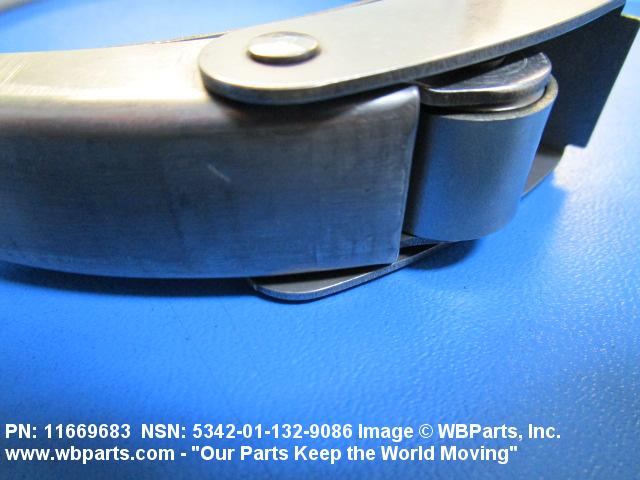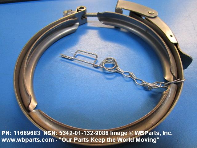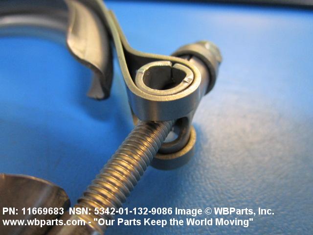 5342-01-132-9086 A metal loop having either a V or U cross section or channelled segment(s). It may be attached to a flat band. It is designed to create a fluid tight joint and/or connect pipe, tubing, tank cover(s), duct(s) and the like, by mating with flanged or beaded ferrule(s), flared, or beaded ends. It may or may not have a sealing inner liner. A latch or latches of the quick coupling type, nut or bolt type, or threaded trunnion type is (are) used to lock and adjust the band. Excludes COUPLING, CLAMP, PIPE and RING, LOCKING, METAL DRUM COVER.