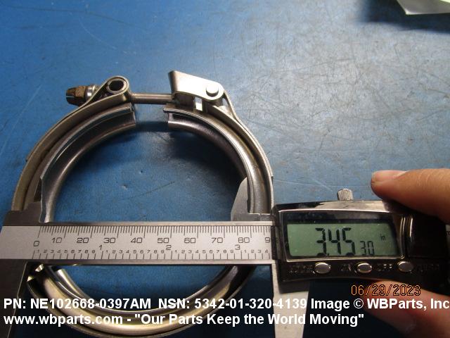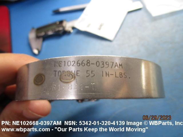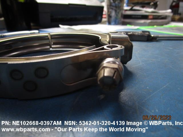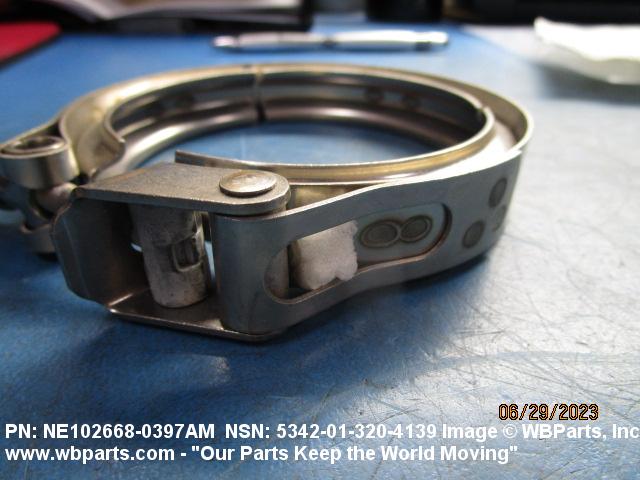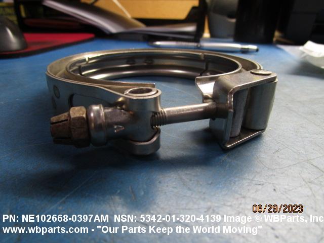 5342-01-320-4139 A metal loop having either a V or U cross section or channelled segment(s). It may be attached to a flat band. It is designed to create a fluid tight joint and/or connect pipe, tubing, tank cover(s), duct(s) and the like, by mating with flanged or beaded ferrule(s), flared, or beaded ends. It may or may not have a sealing inner liner. A latch or latches of the quick coupling type, nut or bolt type, or threaded trunnion type is (are) used to lock and adjust the band. Excludes COUPLING, CLAMP, PIPE and RING, LOCKING, METAL DRUM COVER.