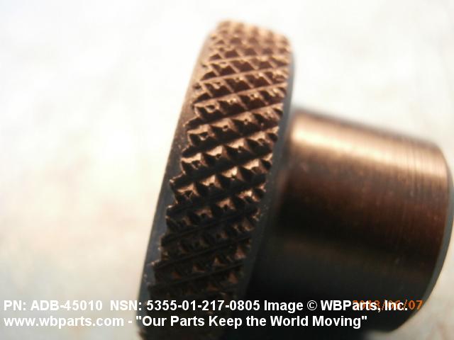 5355-01-217-0805 An item designed to transmit manual, rotary or linear motion to other devices. May include detachable or nondetachable stud (shaft), pointer, or skirt. It may have reference markings in the form of dots, arrows, hairlines, and/or symbols which may be used in conjunction with a calibrated panel, vernier indicator, and the like to indicate the position or motion of items. For items having spokes or simulated spokes radiating from near the center to near the outside rim of the item and relatively thin round disk-shaped items 3 inches (76.2 mm) in diameter or over, see HANDWHEEL. For items calibrated in units or series of divisions to denote relative positioning of devices see DIAL, CONTROL. Excludes DOORKNOB; and HANDLE (as modified).20210050018Guns, through 30mm53550018Knobs and Pointers
