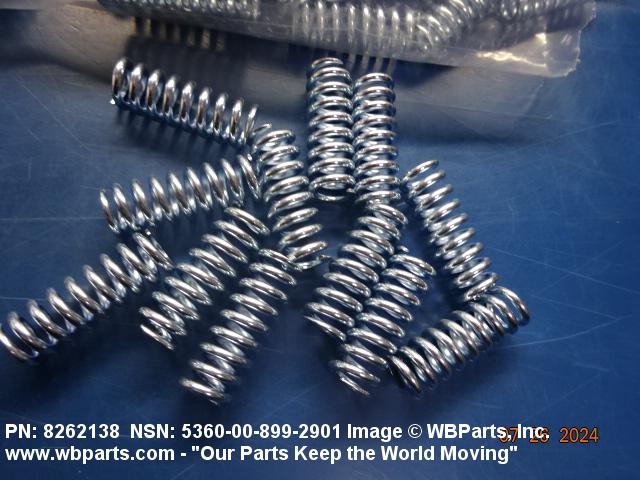 5360-00-899-2901 An open coiled spring, wound in various forms and from different shapes and types of materials and finished at the ends, designed to provide resistance to compression forces. Excludes springs designed for thermal actuation (springs in which the torsion forces are designed to be counteracted by changes in temperature) and SPRING, REINFORCING, HOSE.20210050018Guns, through 30mm53600034Coil, Flat, Leaf, and Wire Springs