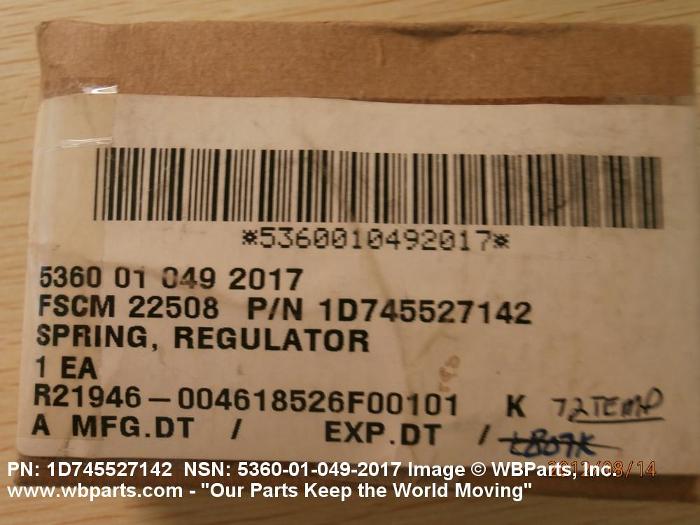 5360-01-049-2017 An open coiled spring, wound in various forms and from different shapes and types of materials and finished at the ends, designed to provide resistance to compression forces. Excludes springs designed for thermal actuation (springs in which the torsion forces are designed to be counteracted by changes in temperature) and SPRING, REINFORCING, HOSE.20210050018Guns, through 30mm53600034Coil, Flat, Leaf, and Wire Springs