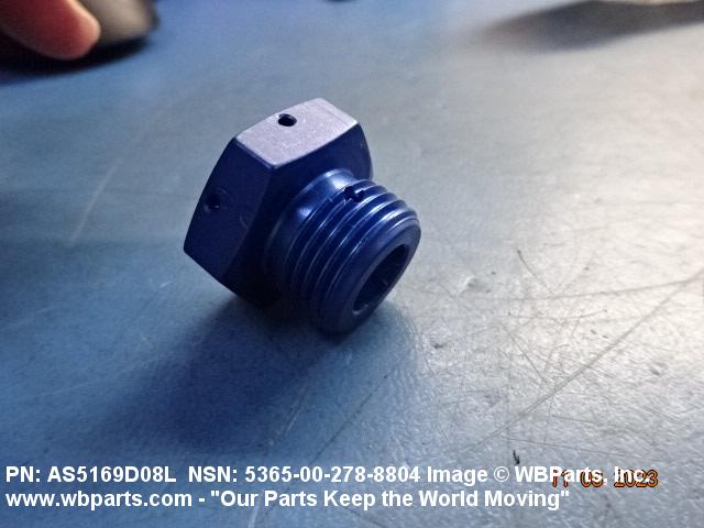 5365-00-278-8804 An item with a cylindrical shaped body having external threads other than pipe or hose series. It is desinged to mate into a preformed threaded component for the purpose of plugging a hole during equipment operation. It may have a head and/or internal drive and may contain a bleeder hole. See also PLUG, PROTECTIVE, DUST AND MOISTURE SEAL and CAP-PLUG, PROTECTIVE, DUST AND MOISTURE SEAL. Excludes PLUG, TUBE FITTING, THREADED.