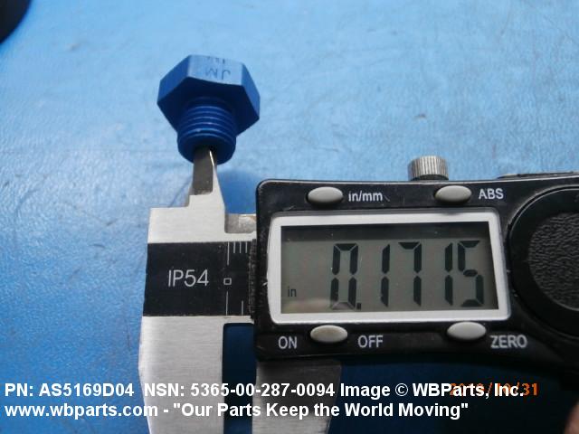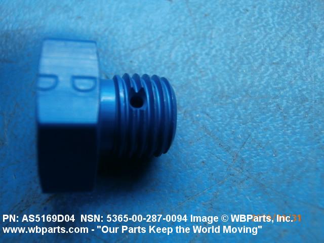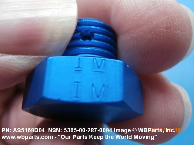 5365-00-287-0094 An item with a cylindrical shaped body having external threads other than pipe or hose series. It is desinged to mate into a preformed threaded component for the purpose of plugging a hole during equipment operation. It may have a head and/or internal drive and may contain a bleeder hole. See also PLUG, PROTECTIVE, DUST AND MOISTURE SEAL and CAP-PLUG, PROTECTIVE, DUST AND MOISTURE SEAL. Excludes PLUG, TUBE FITTING, THREADED.