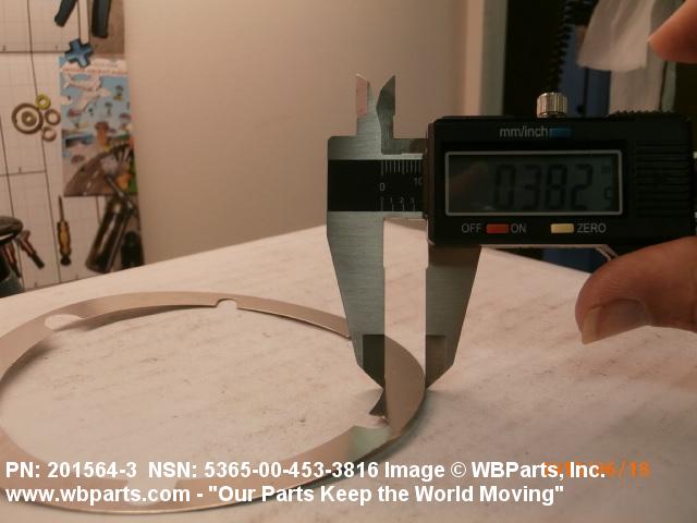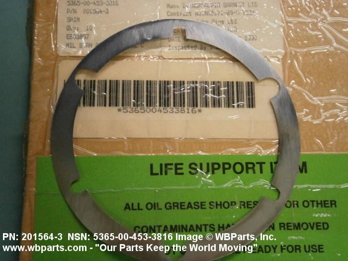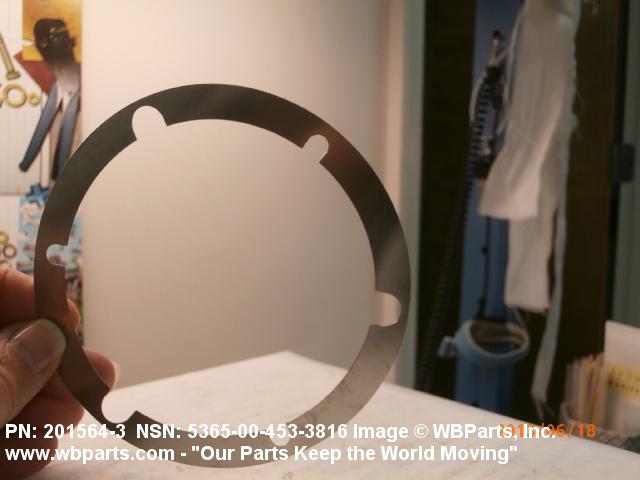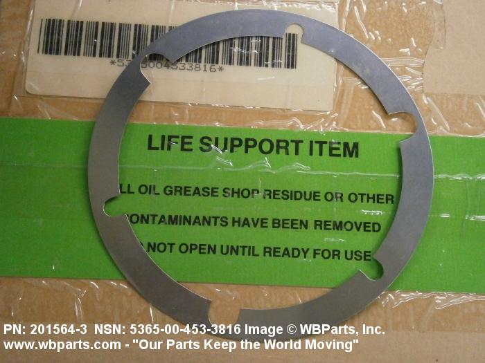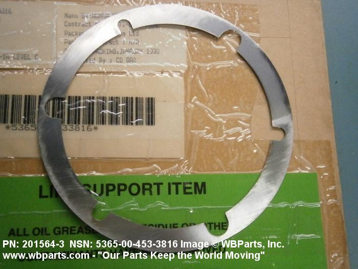 5365-00-453-3816 A thin flat metal or plastic item of various peripheral shapes having a solid or laminated cross-section. It is designed to maintain a predetermined distance between two surfaces. For round items without a hole and having a solid rectangular cross-section use DISK, SOLID, PLAIN. Items with either (1) a solid (not laminated) cross-section, or (2) a non-separable laminated cross-section with one hole centrally located, must have a thickness less than 0.006 inch (0.152 mm) for items less than 1/4 inch (6.35 mm) outside diameter or shortest distance across peripheral flats, and less than 0.016 inch (0.406 mm) for items 1/4 inch (6.35 mm) or more outside diameter, or shortest distance across peripheral flats. For items with thickness greater than those indicated above, see SPACER, PLATE; WASHER, FLAT and SPACER, RING. When thickness and/or outside diameter or shortest distance across peripheral flats is designated as a tolerance dimension, the maximum dimension will be used to determine compliance. See also SHIM STOCK, LAMINATED; SHIM STOCK ASSORTMENT, GASKET; and BEARING, WASHER, THRUST.