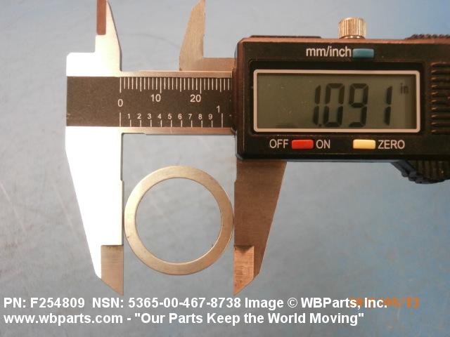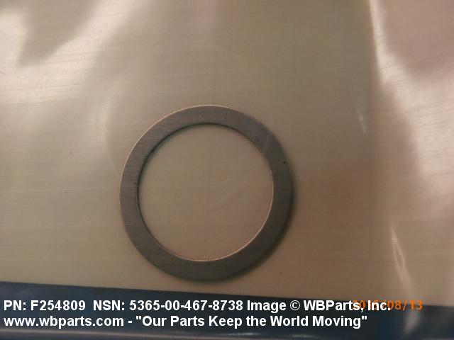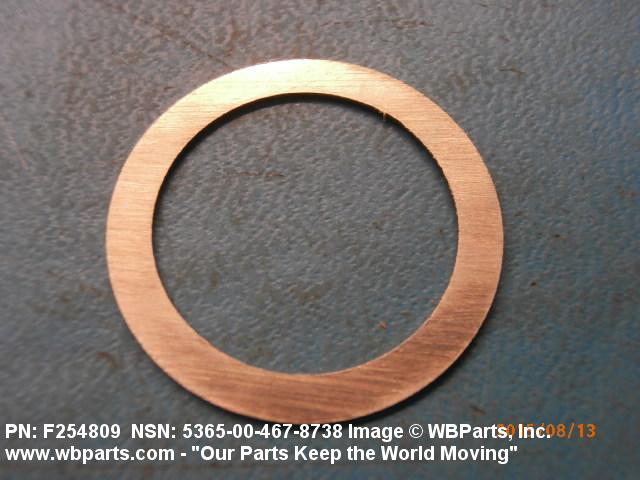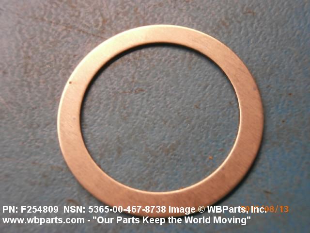 5365-00-467-8738 A circular-shaped item designed to maintain predetermined distance between assembled parts and/or for distributing pressure or preventing endwise movement between member parts. It has a solid cross-section and two flat parallel bearing surfaces. The distance between the bearing surfaces perpendicular to the axis of the centrally located hole shall not exceed 25 percent of the outside diameter. The diameter of the centrally located hole must exceed 75 percent of the outside diameter. Excludes laminated items. For items manufactured from impregnated graphite or lubricated nonmetallic materials, excluding felt or plastics, see GASKET. For items manufactured from lubricated plastics, see BEARING, WASHER, THRUST. For items manufactured from lubricated felt, see FELT, MECHANICAL, PREFORMED. Excludes DISK, VALVE; INSULATOR WASHER; and SHIM. See also SPACER, PLATE and SPACER, SLEEVE.