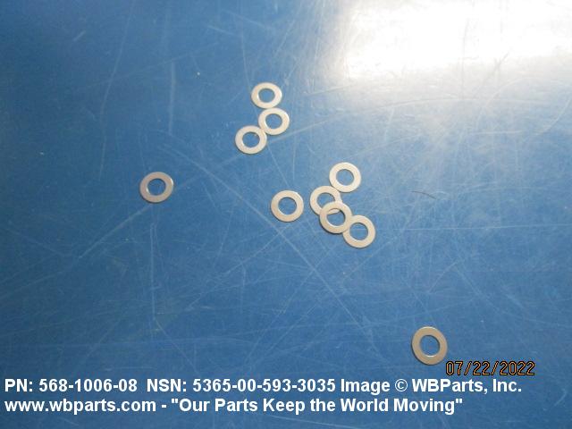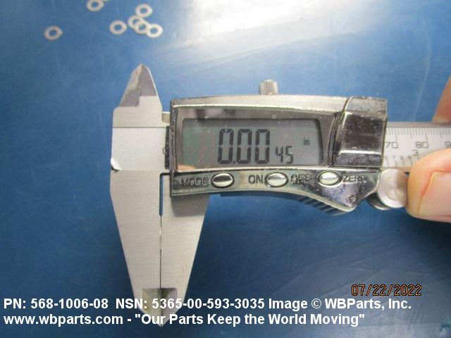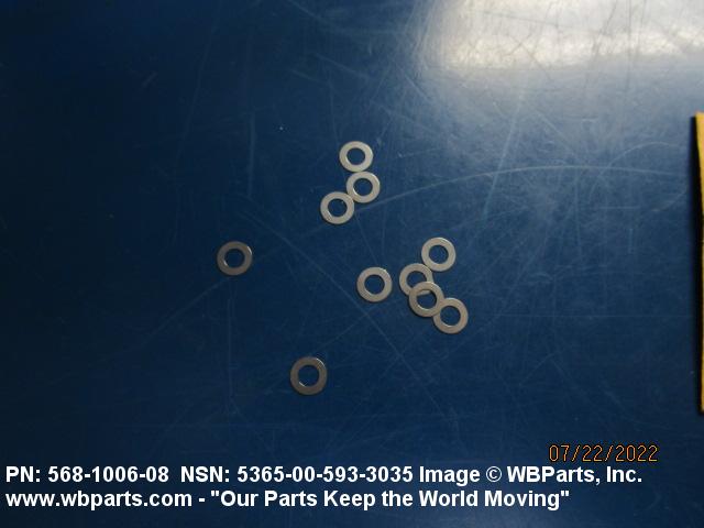 5365-00-593-3035 A thin flat metal or plastic item of various peripheral shapes having a solid or laminated cross-section. It is designed to maintain a predetermined distance between two surfaces. For round items without a hole and having a solid rectangular cross-section use DISK, SOLID, PLAIN. Items with either (1) a solid (not laminated) cross-section, or (2) a non-separable laminated cross-section with one hole centrally located, must have a thickness less than 0.006 inch (0.152 mm) for items less than 1/4 inch (6.35 mm) outside diameter or shortest distance across peripheral flats, and less than 0.016 inch (0.406 mm) for items 1/4 inch (6.35 mm) or more outside diameter, or shortest distance across peripheral flats. For items with thickness greater than those indicated above, see SPACER, PLATE; WASHER, FLAT and SPACER, RING. When thickness and/or outside diameter or shortest distance across peripheral flats is designated as a tolerance dimension, the maximum dimension will be used to determine compliance. See also SHIM STOCK, LAMINATED; SHIM STOCK ASSORTMENT, GASKET; and BEARING, WASHER, THRUST.