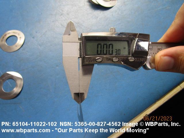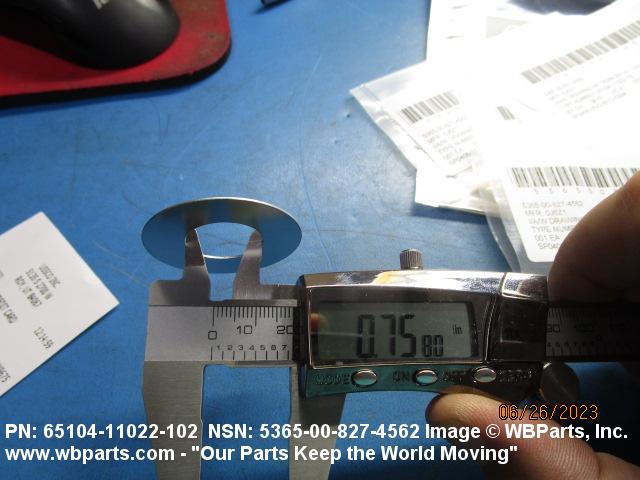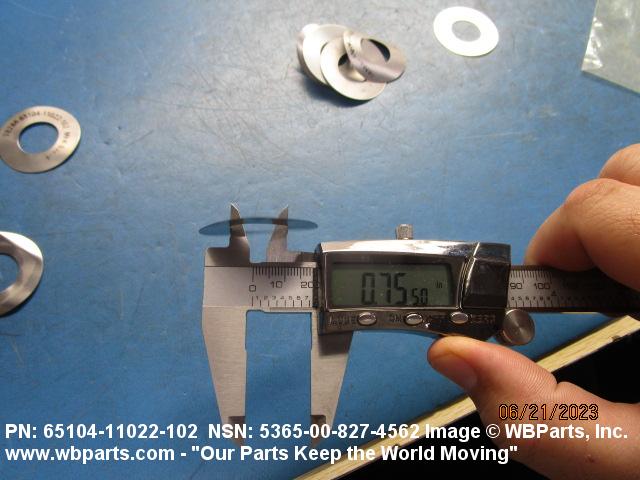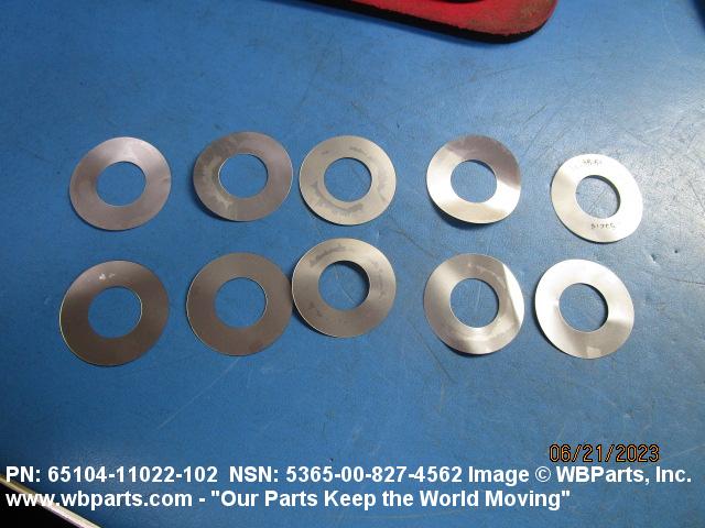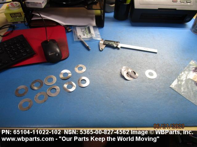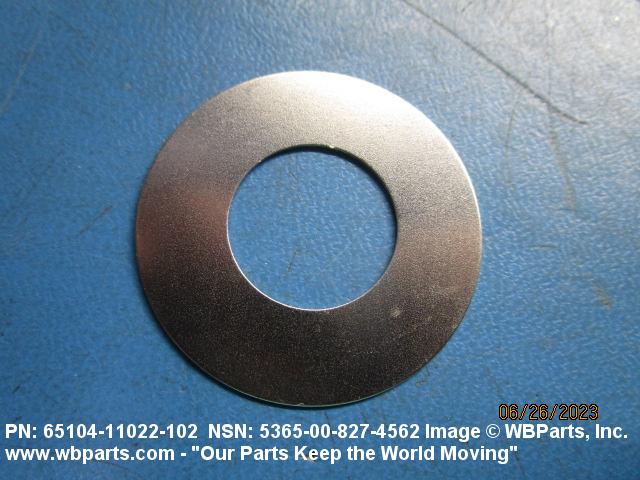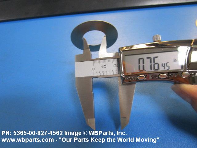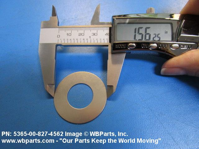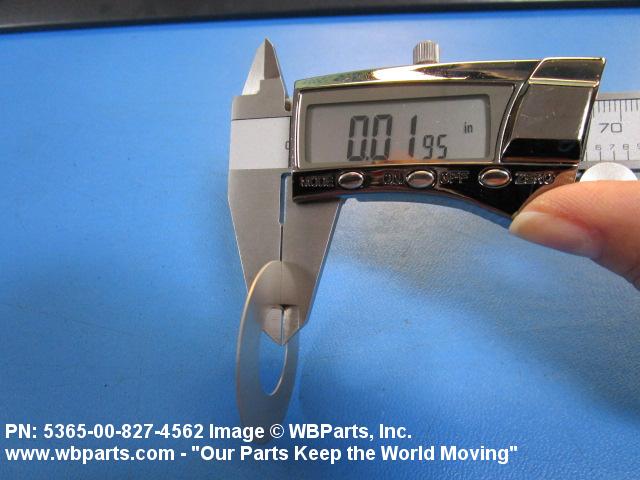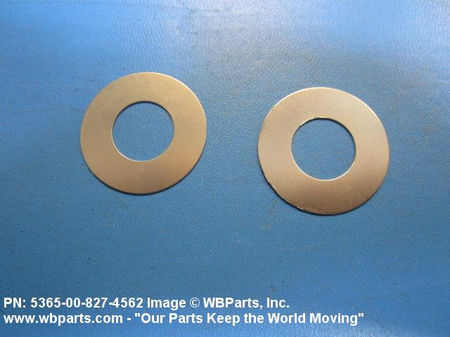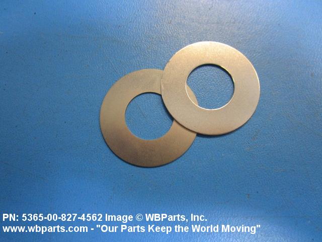 5365-00-827-4562 A thin flat metal or plastic item of various peripheral shapes having a solid or laminated cross-section. It is designed to maintain a predetermined distance between two surfaces. For round items without a hole and having a solid rectangular cross-section use DISK, SOLID, PLAIN. Items with either (1) a solid (not laminated) cross-section, or (2) a non-separable laminated cross-section with one hole centrally located, must have a thickness less than 0.006 inch (0.152 mm) for items less than 1/4 inch (6.35 mm) outside diameter or shortest distance across peripheral flats, and less than 0.016 inch (0.406 mm) for items 1/4 inch (6.35 mm) or more outside diameter, or shortest distance across peripheral flats. For items with thickness greater than those indicated above, see SPACER, PLATE; WASHER, FLAT and SPACER, RING. When thickness and/or outside diameter or shortest distance across peripheral flats is designated as a tolerance dimension, the maximum dimension will be used to determine compliance. See also SHIM STOCK, LAMINATED; SHIM STOCK ASSORTMENT, GASKET; and BEARING, WASHER, THRUST.