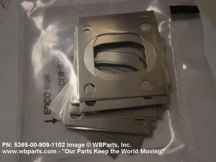 5365-00-909-1102 A thin flat metal or plastic item of various peripheral shapes having a solid or laminated cross-section. It is designed to maintain a predetermined distance between two surfaces. For round items without a hole and having a solid rectangular cross-section use DISK, SOLID, PLAIN. Items with either (1) a solid (not laminated) cross-section, or (2) a non-separable laminated cross-section with one hole centrally located, must have a thickness less than 0.006 inch (0.152 mm) for items less than 1/4 inch (6.35 mm) outside diameter or shortest distance across peripheral flats, and less than 0.016 inch (0.406 mm) for items 1/4 inch (6.35 mm) or more outside diameter, or shortest distance across peripheral flats. For items with thickness greater than those indicated above, see SPACER, PLATE; WASHER, FLAT and SPACER, RING. When thickness and/or outside diameter or shortest distance across peripheral flats is designated as a tolerance dimension, the maximum dimension will be used to determine compliance. See also SHIM STOCK, LAMINATED; SHIM STOCK ASSORTMENT, GASKET; and BEARING, WASHER, THRUST.