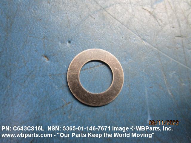 5365-01-146-7671 A thin flat metal or plastic item of various peripheral shapes having a solid or laminated cross-section. It is designed to maintain a predetermined distance between two surfaces. For round items without a hole and having a solid rectangular cross-section use DISK, SOLID, PLAIN. Items with either (1) a solid (not laminated) cross-section, or (2) a non-separable laminated cross-section with one hole centrally located, must have a thickness less than 0.006 inch (0.152 mm) for items less than 1/4 inch (6.35 mm) outside diameter or shortest distance across peripheral flats, and less than 0.016 inch (0.406 mm) for items 1/4 inch (6.35 mm) or more outside diameter, or shortest distance across peripheral flats. For items with thickness greater than those indicated above, see SPACER, PLATE; WASHER, FLAT and SPACER, RING. When thickness and/or outside diameter or shortest distance across peripheral flats is designated as a tolerance dimension, the maximum dimension will be used to determine compliance. See also SHIM STOCK, LAMINATED; SHIM STOCK ASSORTMENT, GASKET; and BEARING, WASHER, THRUST.