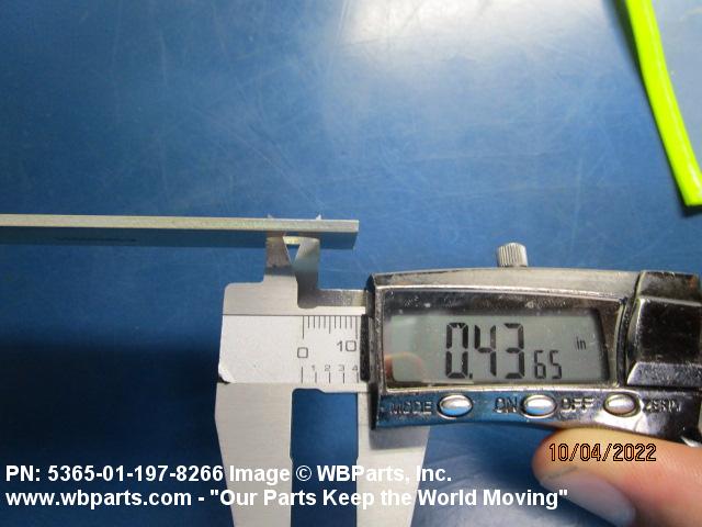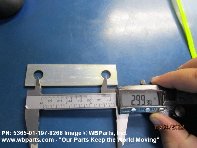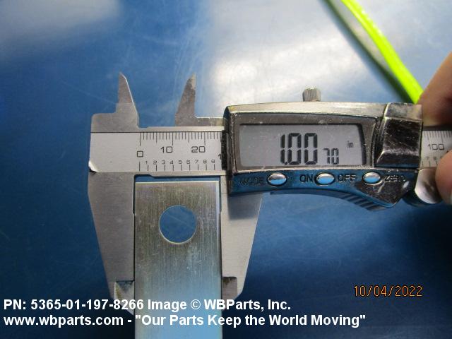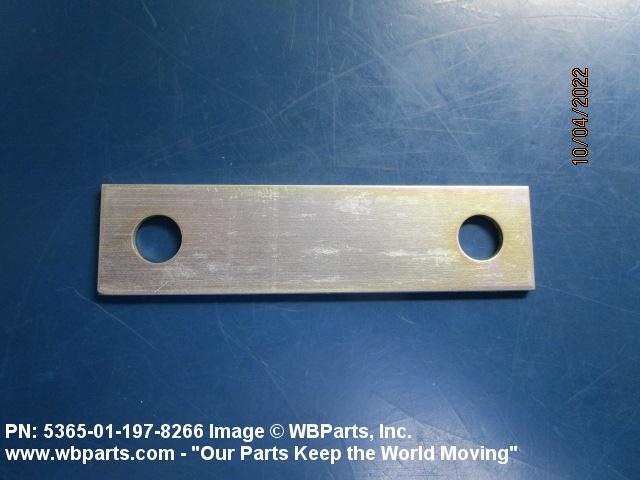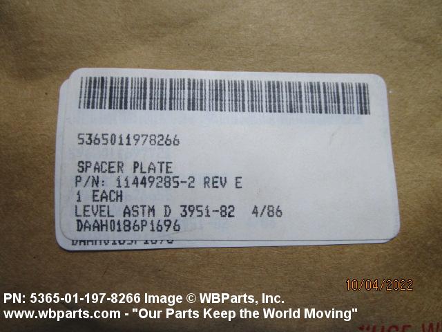 5365-01-197-8266 A flat metal or plastic item of various peripheral shapes having a solid (not laminated) cross-section. It is designed to maintain a predetermined distance between two surfaces. For round items without a hole having a solid rectangular cross-section use DISK, SOLID, PLAIN. For round or hexagonal items with only one hole centrally located and with the length (thickness) exceeding 25 percent of the outside diameter or distance across peripheral flats, see SPACER, SLEEVE. The thickness between the two parallel bearing surfaces must be 0.006 inch, (0.152 mm) or more for items less than 1/4 inch (6.35 mm) across the peripheral diameter, or smallest overall outside dimension, or must be 0.016 inch (0.406 mm) or more for items 1/4 inch (6.35 mm) or greater across the peripheral diameter or smallest overall outside dimension. For items with a thickness less than those indicated above, see SHIM. For items with one hole centrally located conforming to the above dimensional criteria use WASHER, FLAT or SPACER, RING as applicable. When thickness and/or outside diameter or smallest overall outside dimension is designated as a tolerance/dimension the maximum dimension will be used to determine compliance. Excludes GASKET; INSULATOR (as modified) and MOUNTING PAD, ELECTRICAL-ELECTRONIC COMPONENT.202259000005365000000