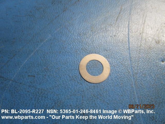5365-01-246-8461 A thin flat metal or plastic item of various peripheral shapes having a solid or laminated cross-section. It is designed to maintain a predetermined distance between two surfaces. For round items without a hole and having a solid rectangular cross-section use DISK, SOLID, PLAIN. Items with either (1) a solid (not laminated) cross-section, or (2) a non-separable laminated cross-section with one hole centrally located, must have a thickness less than 0.006 inch (0.152 mm) for items less than 1/4 inch (6.35 mm) outside diameter or shortest distance across peripheral flats, and less than 0.016 inch (0.406 mm) for items 1/4 inch (6.35 mm) or more outside diameter, or shortest distance across peripheral flats. For items with thickness greater than those indicated above, see SPACER, PLATE; WASHER, FLAT and SPACER, RING. When thickness and/or outside diameter or shortest distance across peripheral flats is designated as a tolerance dimension, the maximum dimension will be used to determine compliance. See also SHIM STOCK, LAMINATED; SHIM STOCK ASSORTMENT, GASKET; and BEARING, WASHER, THRUST.