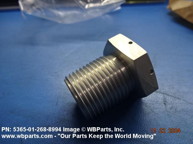 5365-01-268-8994 An item with a cylindrical shaped body having external threads other than pipe or hose series. It is desinged to mate into a preformed threaded component for the purpose of plugging a hole during equipment operation. It may have a head and/or internal drive and may contain a bleeder hole. See also PLUG, PROTECTIVE, DUST AND MOISTURE SEAL and CAP-PLUG, PROTECTIVE, DUST AND MOISTURE SEAL. Excludes PLUG, TUBE FITTING, THREADED.