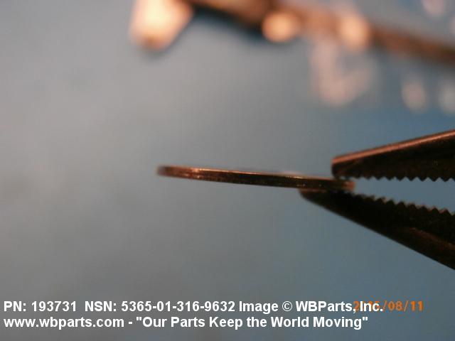 5365-01-316-9632 A circular-shaped item designed to maintain predetermined distance between assembled parts and/or for distributing pressure or preventing endwise movement between member parts. It has a solid cross-section and two flat parallel bearing surfaces. The distance between the bearing surfaces perpendicular to the axis of the centrally located hole shall not exceed 25 percent of the outside diameter. The diameter of the centrally located hole must exceed 75 percent of the outside diameter. Excludes laminated items. For items manufactured from impregnated graphite or lubricated nonmetallic materials, excluding felt or plastics, see GASKET. For items manufactured from lubricated plastics, see BEARING, WASHER, THRUST. For items manufactured from lubricated felt, see FELT, MECHANICAL, PREFORMED. Excludes DISK, VALVE; INSULATOR WASHER; and SHIM. See also SPACER, PLATE and SPACER, SLEEVE.