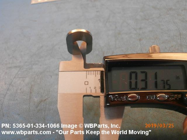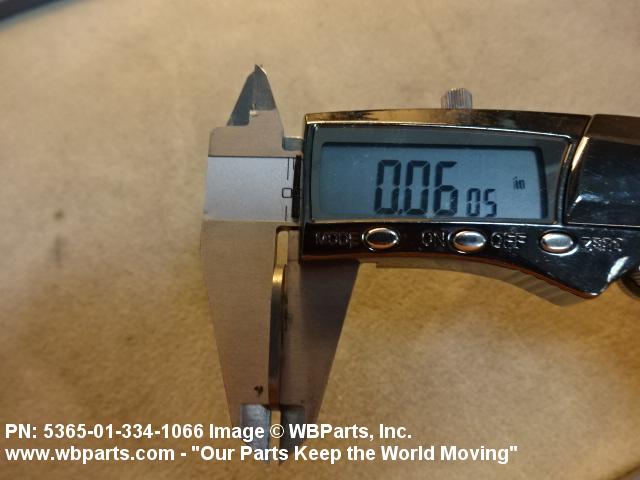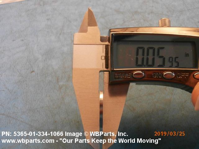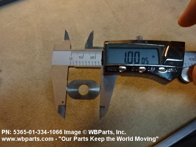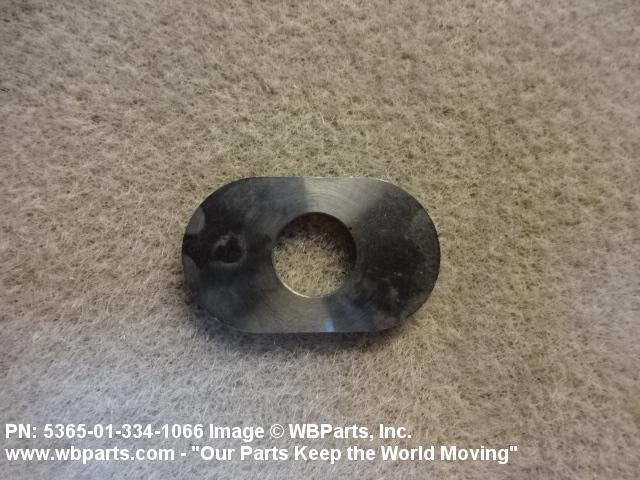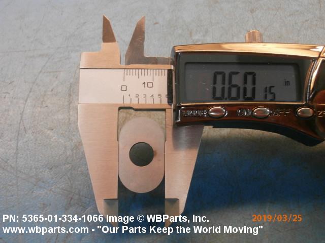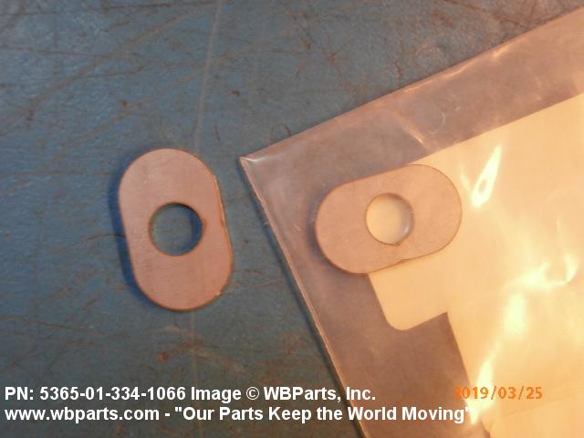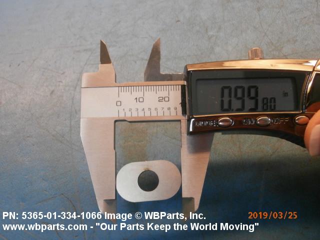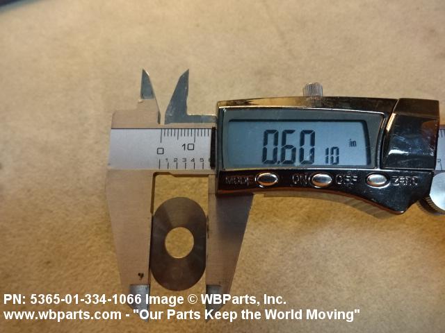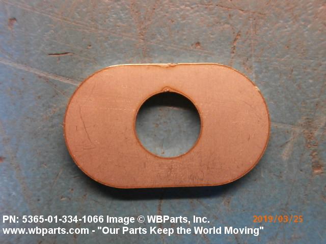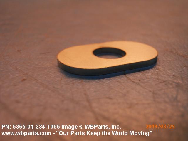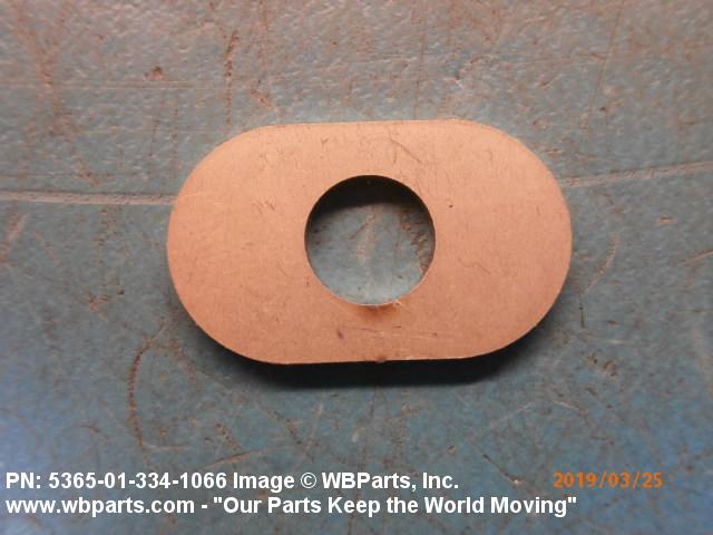 5365-01-334-1066 A flat metal or plastic item of various peripheral shapes having a solid (not laminated) cross-section. It is designed to maintain a predetermined distance between two surfaces. For round items without a hole having a solid rectangular cross-section use DISK, SOLID, PLAIN. For round or hexagonal items with only one hole centrally located and with the length (thickness) exceeding 25 percent of the outside diameter or distance across peripheral flats, see SPACER, SLEEVE. The thickness between the two parallel bearing surfaces must be 0.006 inch, (0.152 mm) or more for items less than 1/4 inch (6.35 mm) across the peripheral diameter, or smallest overall outside dimension, or must be 0.016 inch (0.406 mm) or more for items 1/4 inch (6.35 mm) or greater across the peripheral diameter or smallest overall outside dimension. For items with a thickness less than those indicated above, see SHIM. For items with one hole centrally located conforming to the above dimensional criteria use WASHER, FLAT or SPACER, RING as applicable. When thickness and/or outside diameter or smallest overall outside dimension is designated as a tolerance/dimension the maximum dimension will be used to determine compliance. Excludes GASKET; INSULATOR (as modified) and MOUNTING PAD, ELECTRICAL-ELECTRONIC COMPONENT.202259000005365000000