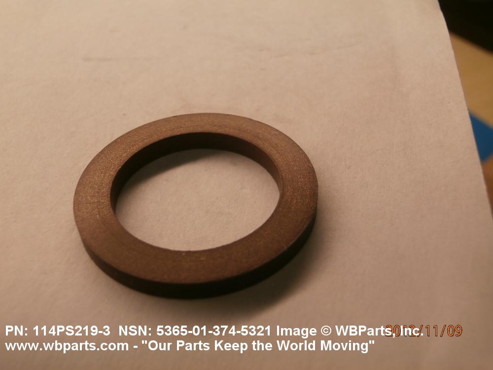 5365-01-374-5321 A circular-shaped item designed to maintain predetermined distance between assembled parts and/or for distributing pressure or preventing endwise movement between member parts. It has a solid cross-section and two flat parallel bearing surfaces. The distance between the bearing surfaces perpendicular to the axis of the centrally located hole shall not exceed 25 percent of the outside diameter. The diameter of the centrally located hole must exceed 75 percent of the outside diameter. Excludes laminated items. For items manufactured from impregnated graphite or lubricated nonmetallic materials, excluding felt or plastics, see GASKET. For items manufactured from lubricated plastics, see BEARING, WASHER, THRUST. For items manufactured from lubricated felt, see FELT, MECHANICAL, PREFORMED. Excludes DISK, VALVE; INSULATOR WASHER; and SHIM. See also SPACER, PLATE and SPACER, SLEEVE.