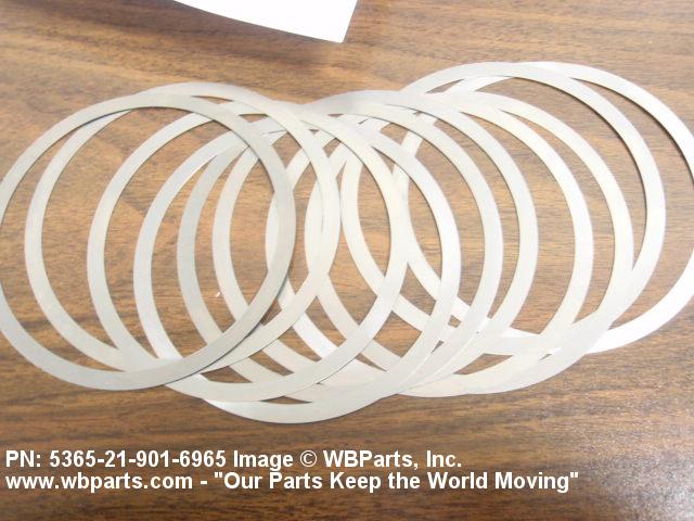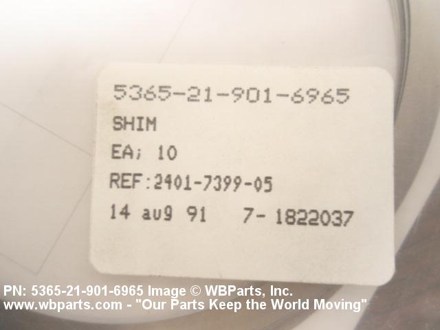 5365-21-901-6965 A thin flat metal or plastic item of various peripheral shapes having a solid or laminated cross-section. It is designed to maintain a predetermined distance between two surfaces. For round items without a hole and having a solid rectangular cross-section use DISK, SOLID, PLAIN. Items with either (1) a solid (not laminated) cross-section, or (2) a non-separable laminated cross-section with one hole centrally located, must have a thickness less than 0.006 inch (0.152 mm) for items less than 1/4 inch (6.35 mm) outside diameter or shortest distance across peripheral flats, and less than 0.016 inch (0.406 mm) for items 1/4 inch (6.35 mm) or more outside diameter, or shortest distance across peripheral flats. For items with thickness greater than those indicated above, see SPACER, PLATE; WASHER, FLAT and SPACER, RING. When thickness and/or outside diameter or shortest distance across peripheral flats is designated as a tolerance dimension, the maximum dimension will be used to determine compliance. See also SHIM STOCK, LAMINATED; SHIM STOCK ASSORTMENT, GASKET; and BEARING, WASHER, THRUST.