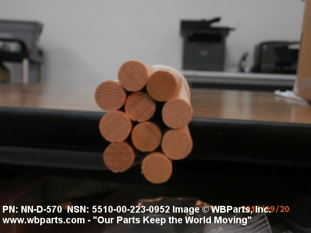 5510-00-978-6858 A cylindrical wooden pin, the grain of which runs lengthwise, used to fit into holes of corresponding size in abutting pieces of wood to serve as a temporary fastening, or to keep them permanently in their relative positions; also a cylindrical wooden rod or stick used for cutting into dowels.