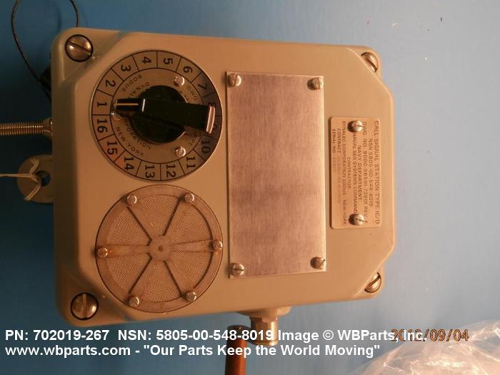 5805-00-548-8019 A manually operated device which converts mechanical power into electrical energy for actuating an audible tone and may also actuate a visible signal at a similar remote station. It also receives electrical energy from another similar station and converts it into acoustical energy and may also actuate a visual signal. Includes a hand ringing generator, audible signalling device and cabinet. May include a selector switch, visual signal or volume control. See also GENERATOR, RINGING, HAND.20258050033Telephone and Telegraph Equipment58300062Intercommunication and Public Address Systems, Except Airborne