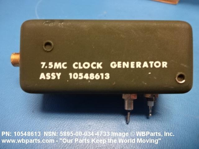 5895-00-034-4733 An item consisting of an oscillator, amplifiers, waveform clippers, frequency dividers, and the like. It provides a series of pulses, or pulse reference frames of information relating to precise time data, that is applied to other components for purposes of synchronization and control. It may derive signals from internal circuitry, auxiliary external circuitry, or from sources such as the National Bureau of Standards Radio Station WWV. The item may include an integral register for circuit monitoring and adjustment purposes only. For items that are not compared to a standard time signal source, but are used as time bases for system triggers, synchronizing sources and the like, see GENERATOR, REFERENCE SIGNAL; GENERATOR, ELECTRONIC COMMAND SIGNALS and GENERATOR, PULSE.20258950037Miscellaneous Communication Equipment66250070Electrical and Electronic Properties Measuring and Testing Instruments