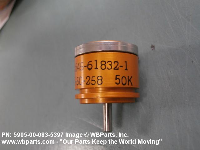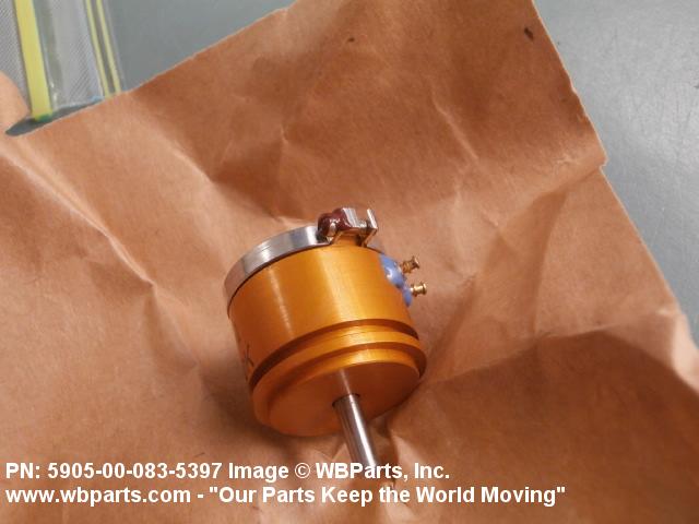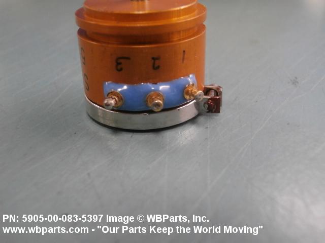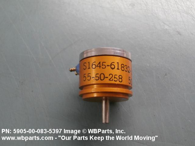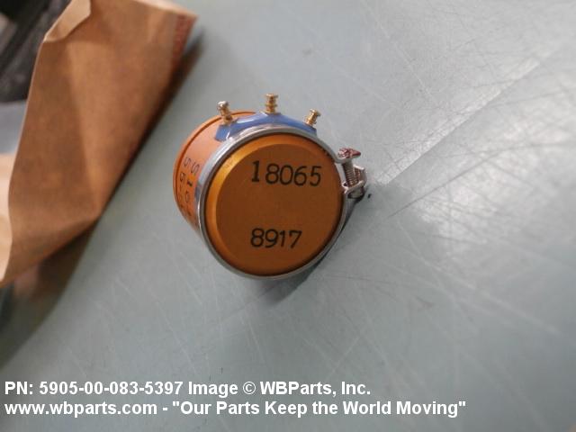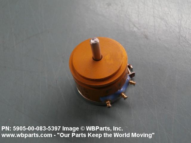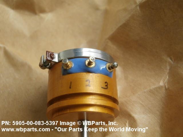 5905-00-083-5397 A resistor in which a sliding or rolling contact moves over an exposed area of the resistive element to change the ohmic value of the output. The functional tolerance (linearity), if given, of the output is greater than plus of minus 1 percent on linear outputs. Specified outputs such as sine, cosine, tangent, etc., shall be considered to be precision. For items having manually positioned taps designed to be set and fixed prior to use, see RESISTOR, ADJUSTABLE. For items with step by step variation, see RHEOSTAT and RESISTOR, STEP BY STEP. For tandem-mounted items designed to function together as an attenuator (and rated accordingly), see ATTENUATOR, VARIABLE. Excludes RESISTOR (1), VARIABLE, NONWIRE WOUND, NONPRECISION; RESISTOR (1), VARIABLE, NONWIRE WOUND, PRECISION; and RESISTOR (1), VARIABLE, WIRE WOUND, PRECISION.