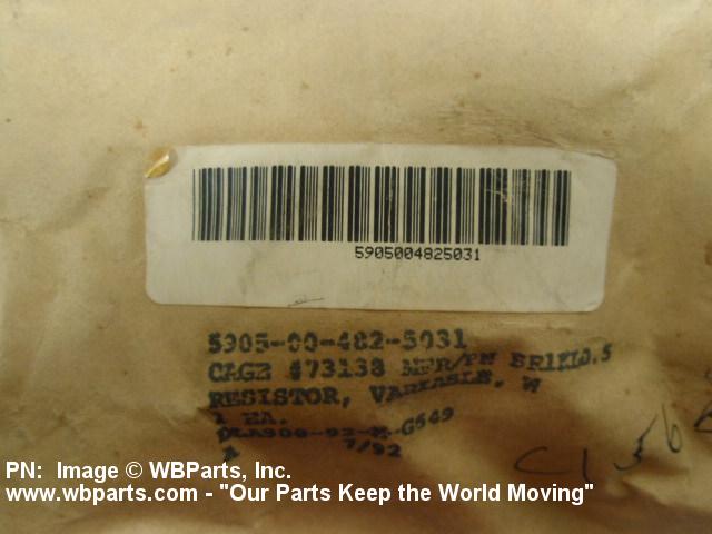 5905-00-482-5031 A resistor in which a sliding or rolling contact moves over an exposed area of the resistive element to change the ohmic value of the output. The functional tolerance (linearity) of the output is equal to or less than plus or munus 1 percent on linear outputs. Specified outputs such as sine, cosine, tangent, etc., shall be considered to be precision. For items having manually positioned taps designed to be set and fixed prior to use, see RESISTOR, ADJUSTABLE, For items with step by step variation, see RHEOSTAT and RESISTOR, STEP BY STEP. For tandem-mounted items designed to function together as an attenuator (and rated accordingly), see ATTENUATOR, VARIABLE. Excludes RESISTOR (1), VARIABLE, NONWIRE WOUND, NONPRECISION; RESISTOR (1), VARIABLE, NONWIRE WOUND, PRECISION; and RESISTOR (1), VARIABLE, WIRE WOUND, NONPRECISION.