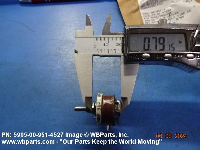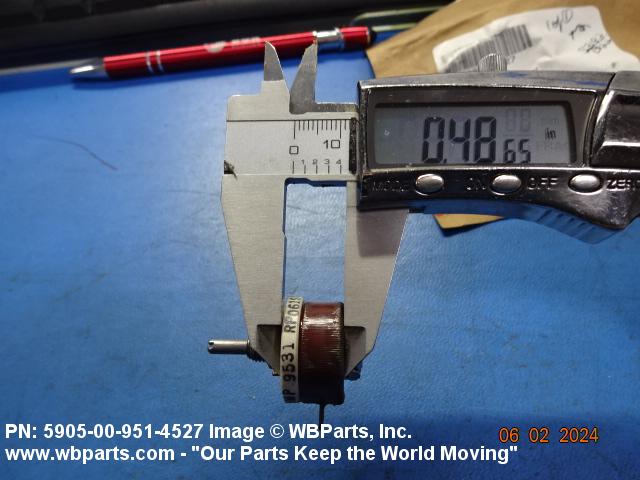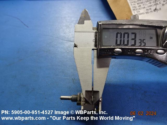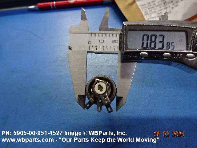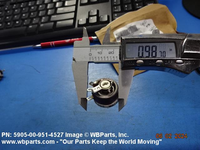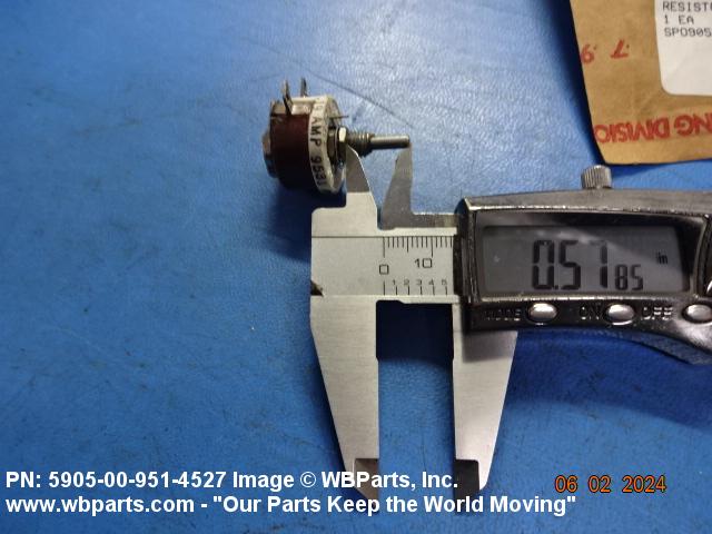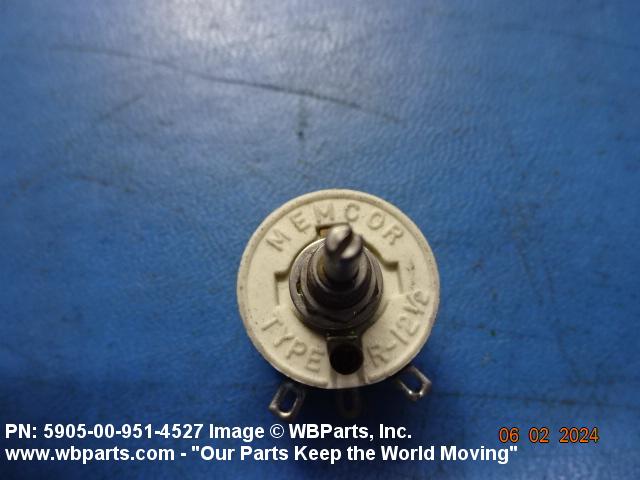 5905-00-951-4527 A resistor in which a sliding or rolling contact moves over an exposed area of the resistive element to change the ohmic value of the output. The functional tolerance (linearity), if given, of the output is greater than plus of minus 1 percent on linear outputs. Specified outputs such as sine, cosine, tangent, etc., shall be considered to be precision. For items having manually positioned taps designed to be set and fixed prior to use, see RESISTOR, ADJUSTABLE. For items with step by step variation, see RHEOSTAT and RESISTOR, STEP BY STEP. For tandem-mounted items designed to function together as an attenuator (and rated accordingly), see ATTENUATOR, VARIABLE. Excludes RESISTOR (1), VARIABLE, NONWIRE WOUND, NONPRECISION; RESISTOR (1), VARIABLE, NONWIRE WOUND, PRECISION; and RESISTOR (1), VARIABLE, WIRE WOUND, PRECISION.