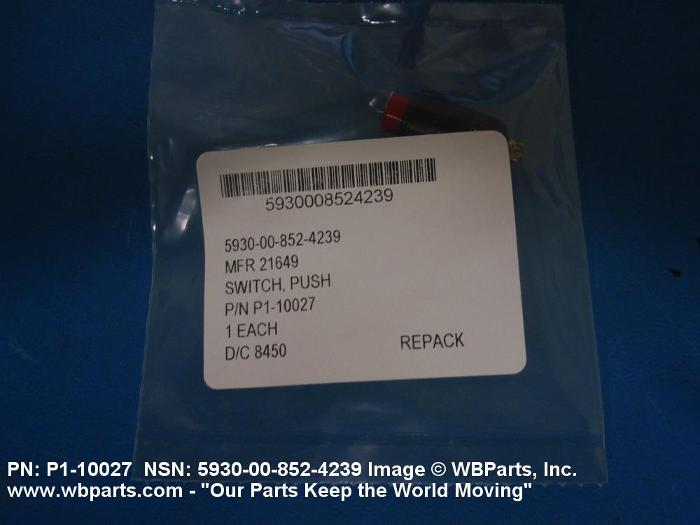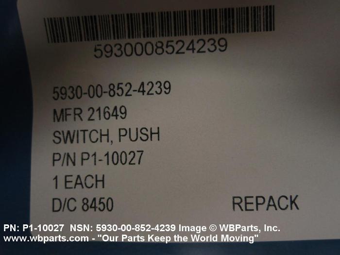 5930-00-852-4239 A switch that is externally actuated by a device such as a push rod or button, which requires pushing for each actuation. The action may be momentary, with mechanical return. The actuating device may or may not be an integral part of the switch. The item may include provisions for mounting indicating lamp(s) or light emitting diode(s) in the actuator. Includes items consisting of individually separable switches that are physically interlocked, that have a common actuator, or are electrically connected. Excludes LIGHT-SWITCH; LIGHT-SWITCH ASSEMBLY; SWITCH, BEAM SELECTING, HEADLIGHT; SWITCH, FOOT; SWITCH, INTERLOCK; SWITCH, PRESSURE; SWITCH, PUSH-PULL; SWITCH, SENSITIVE and SWITCH ASSEMBLY. For devices which start, stop, reverse, select and/or regulate the speed of a motor, see STARTER, MOTOR and CONTROLLER, MOTOR.
