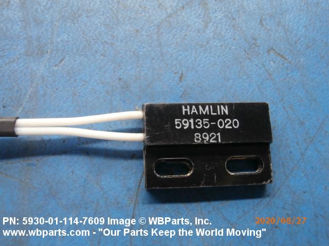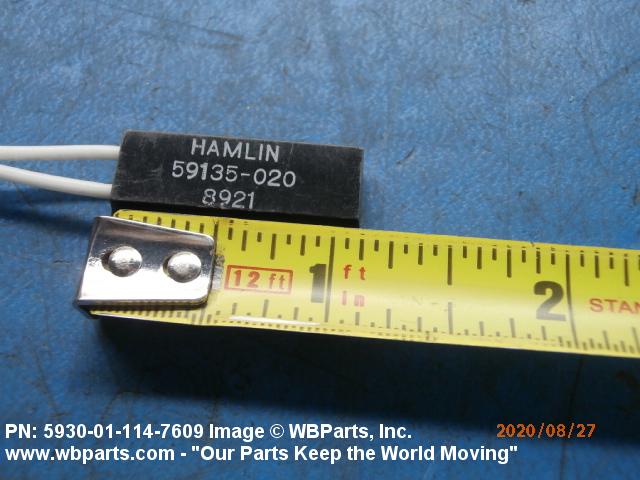 5930-01-114-7609 A switch designed to perform the function of opening and/or closing one or more electrical circuits. The switching function is accomplished by means of separable contacts, semiconductor devices, or a combination of separable contacts and semiconductor devices. The item functions in response to electrical changes in its internal circuit caused by capacitance, inductance, or magnetic flux changes. It is activated by permanent magnets, metallic materials, or nonmetallic materials which come within its sensing range. For sensing switches which respond to changes other than capacitance, inductance, or magnetic flux, see SWITCH, AIRFLOW; SWITCH, CENTRIFUGAL; SWITCH, INERTIA; SWITCH, PRESSURE; SWITCH, PRESSURE-THERMOSTATIC; SWITCH, THERMOSTATIC; and SWITCH, TILT.