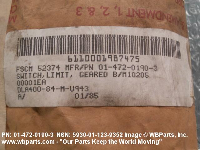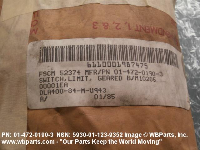 Part Alternates: 0143500995PC90, 01-435-0099-5PC90, 0147201903, 01-472-0190-3, 01-472-0190-3 ASSY B, 0147201903ASSYB, 0147203083, 01-472-0308-3, 10205, 5930-01-123-9352, 01-123-9352, 5930011239352, 011239352