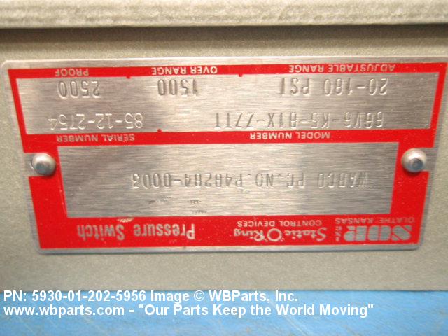 5930-01-202-5956 A switch which is actuated by changes in pressure of any gas or liquid or by changes in a vacuum acting upon its sensing element. Excludes BAROSWITCH; SWITCH, PRESSURE-THERMOSTATIC; and SWITCH, SENSITIVE.