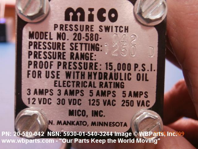 5930-01-540-3244 A switch which is actuated by changes in pressure of any gas or liquid or by changes in a vacuum acting upon its sensing element. Excludes BAROSWITCH; SWITCH, PRESSURE-THERMOSTATIC; and SWITCH, SENSITIVE.