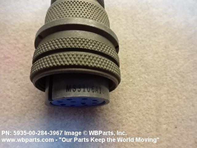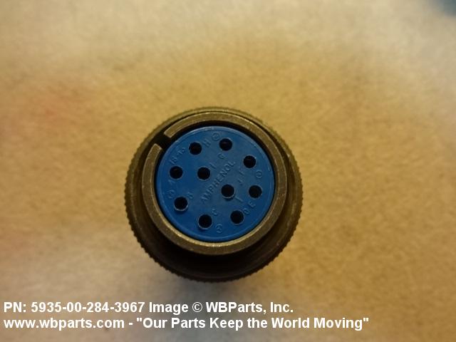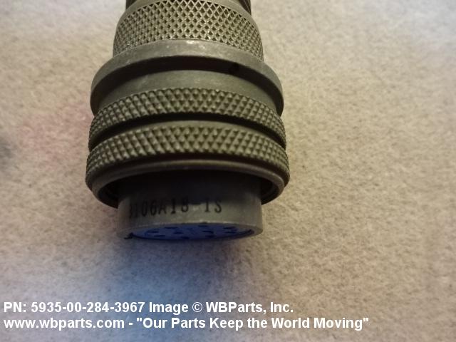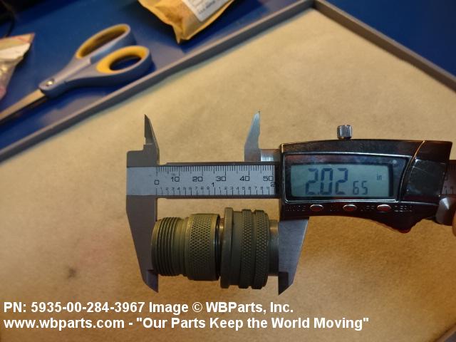 5935-00-284-3967 An electrical fitting with electrical contacts, constructed to be affixed to the end of a cable, conduit, coaxial line, cord or wiring for convenience in joining with other electrical connector(s) or PRINTED WIRING BOARD and is not designed to be mounted on a bulkhead, chasses, panel, PRINTED WIRING BOARD, or the like. Excludes JACK, TELEPHONE; JACK, TIP; PLUG, TELEPHONE; PLUG TIP; INSERT, ELECTRICAL CONNECTOR; CONNECTOR BODY (as modified); and SOCKET, PLUG-IN, ELECTRONIC COMPONENTS. See also LEAD ASSEMBLY, ELECTRICAL; WIRING HARNESS (as modified); and CABLE ASSEMBLY (as modified). For items without inserts, see SHELL, ELECTRICAL CONNECTOR.