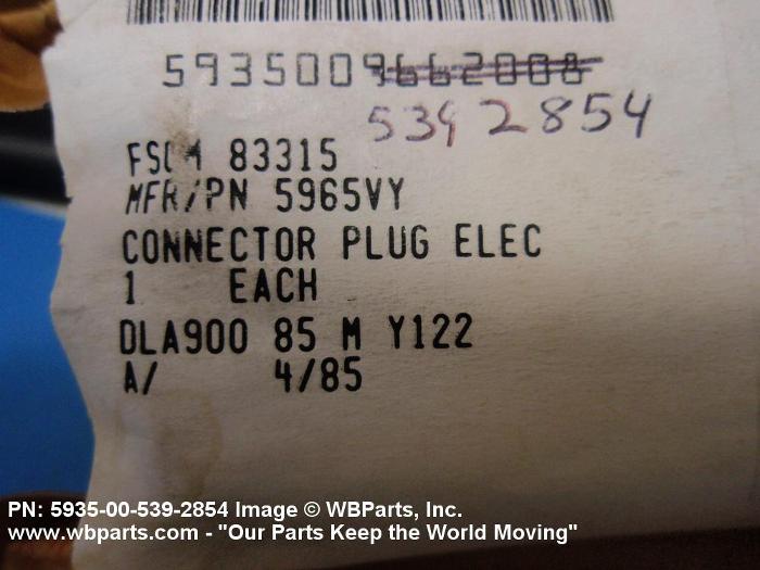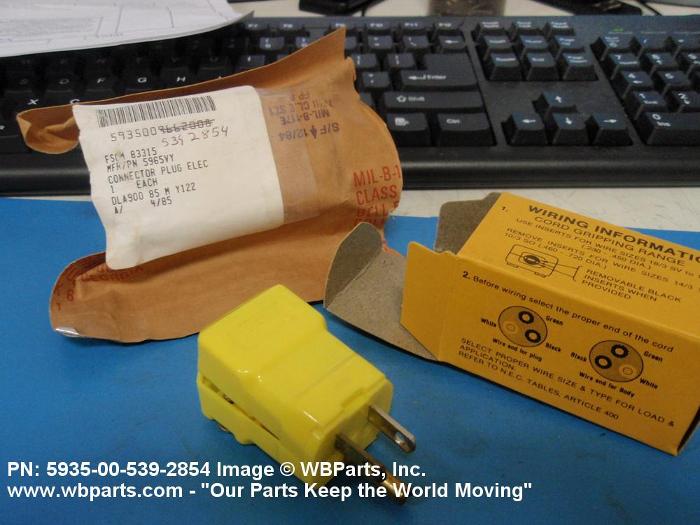 5935-00-539-2854 An electrical fitting with electrical contacts, constructed to be affixed to the end of a cable, conduit, coaxial line, cord or wiring for convenience in joining with other electrical connector(s) or PRINTED WIRING BOARD and is not designed to be mounted on a bulkhead, chasses, panel, PRINTED WIRING BOARD, or the like. Excludes JACK, TELEPHONE; JACK, TIP; PLUG, TELEPHONE; PLUG TIP; INSERT, ELECTRICAL CONNECTOR; CONNECTOR BODY (as modified); and SOCKET, PLUG-IN, ELECTRONIC COMPONENTS. See also LEAD ASSEMBLY, ELECTRICAL; WIRING HARNESS (as modified); and CABLE ASSEMBLY (as modified). For items without inserts, see SHELL, ELECTRICAL CONNECTOR.