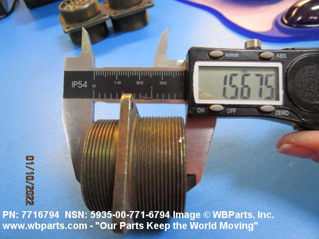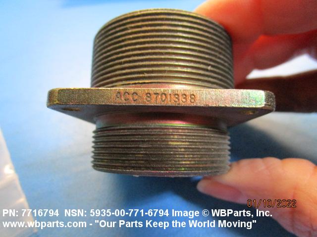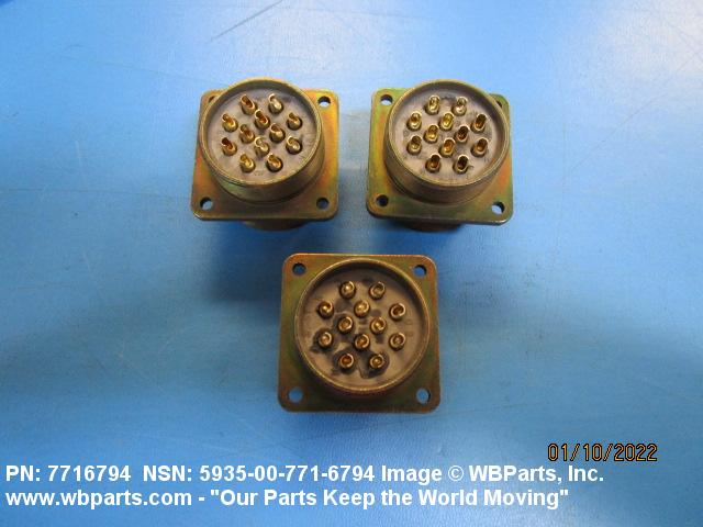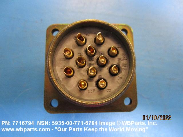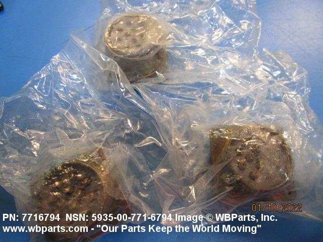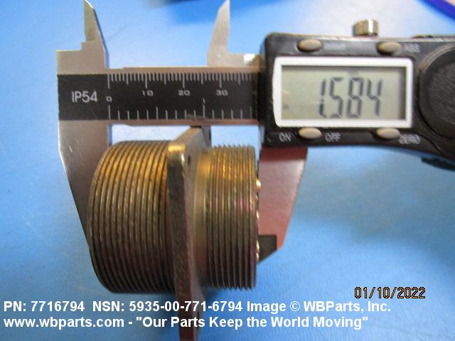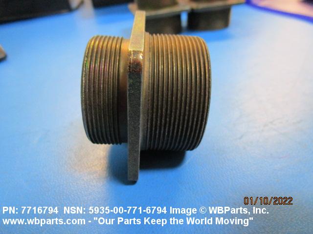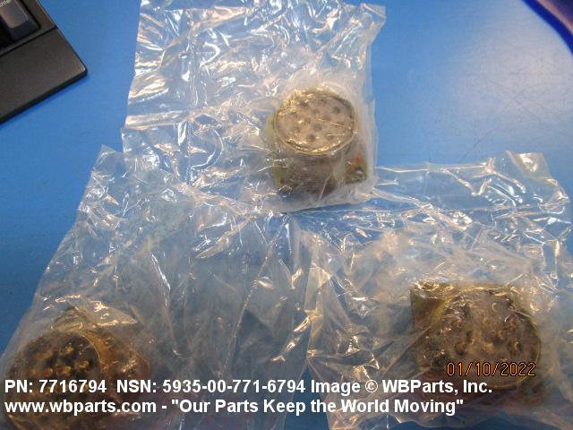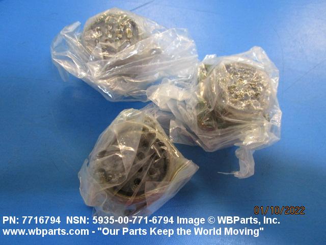 5935-00-771-6794 An electrical fitting with electrical contacts constructed to be affixed to the end of a cable, conduit, coaxial line, cord, wire (includes printed/etched), PRINTED WIRING BOARD, or the like for convenience in joining with another electrical connector(s) or PRINTED WIRING BOARD. It is designed to be mounted on a bulkhead, chassis, panel, wall, PRINTED WIRING BOARD, or the like. Excludes LAMPHOLDER; JACK, TELEPHONE; JACK, TIP; INSERT ELECTRICAL CONNECTOR; INSERT MODULE, ELECTRICAL CONNECTOR; CONNECTOR BODY (as modified) and SOCKET, PLUG-IN ELECTRONIC COMPONENTS. See also WIRING HARNESS (as modified) and CABLE ASSEMBLY (as modified). For items with termination wires of more than four inches in length, see LEAD ASSEMBLY, ELECTRICAL. For items without inserts, see SHELL, ELECTRICAL CONNECTOR.