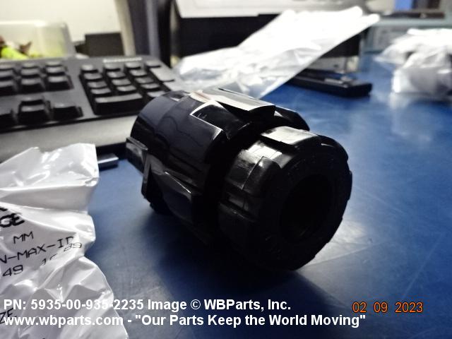 5935-00-935-2235 An electrical fitting with electrical contacts, constructed to be affixed to the end of a cable, conduit, coaxial line, cord or wiring for convenience in joining with other electrical connector(s) or PRINTED WIRING BOARD and is not designed to be mounted on a bulkhead, chasses, panel, PRINTED WIRING BOARD, or the like. Excludes JACK, TELEPHONE; JACK, TIP; PLUG, TELEPHONE; PLUG TIP; INSERT, ELECTRICAL CONNECTOR; CONNECTOR BODY (as modified); and SOCKET, PLUG-IN, ELECTRONIC COMPONENTS. See also LEAD ASSEMBLY, ELECTRICAL; WIRING HARNESS (as modified); and CABLE ASSEMBLY (as modified). For items without inserts, see SHELL, ELECTRICAL CONNECTOR.