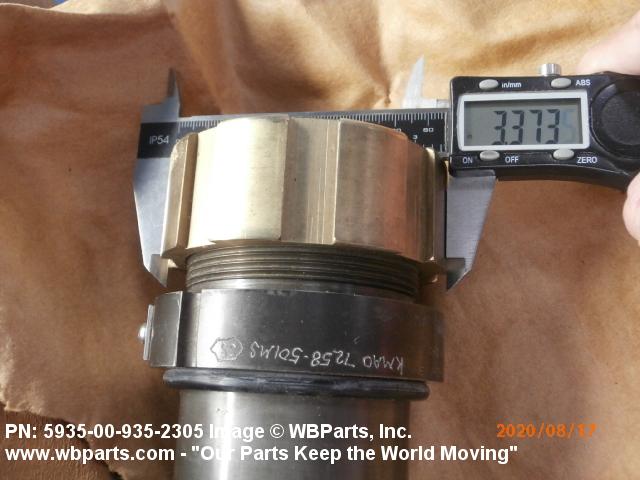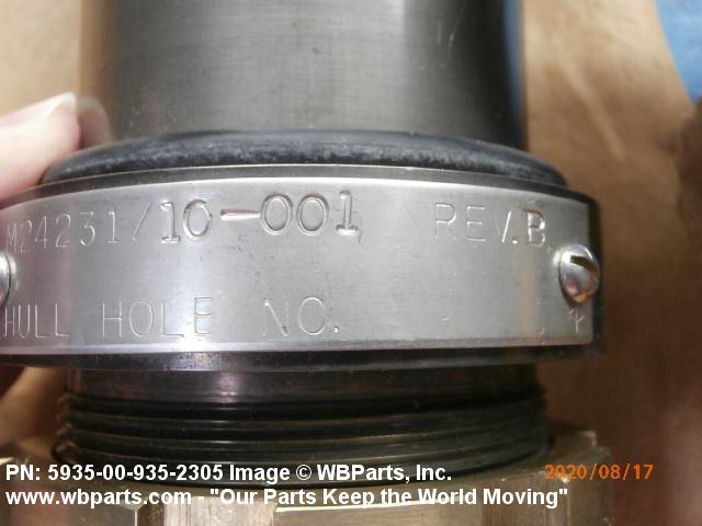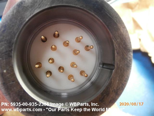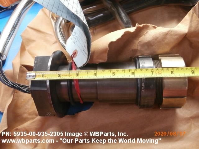 5935-00-935-2305 An electrical fitting with electrical contacts constructed to be affixed to the end of a cable, conduit, coaxial line, cord, wire (includes printed/etched), PRINTED WIRING BOARD, or the like for convenience in joining with another electrical connector(s) or PRINTED WIRING BOARD. It is designed to be mounted on a bulkhead, chassis, panel, wall, PRINTED WIRING BOARD, or the like. Excludes LAMPHOLDER; JACK, TELEPHONE; JACK, TIP; INSERT ELECTRICAL CONNECTOR; INSERT MODULE, ELECTRICAL CONNECTOR; CONNECTOR BODY (as modified) and SOCKET, PLUG-IN ELECTRONIC COMPONENTS. See also WIRING HARNESS (as modified) and CABLE ASSEMBLY (as modified). For items with termination wires of more than four inches in length, see LEAD ASSEMBLY, ELECTRICAL. For items without inserts, see SHELL, ELECTRICAL CONNECTOR.