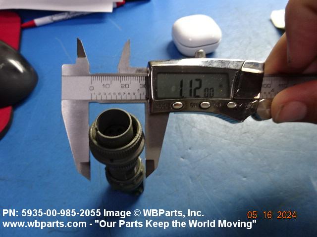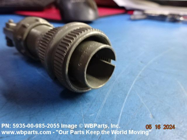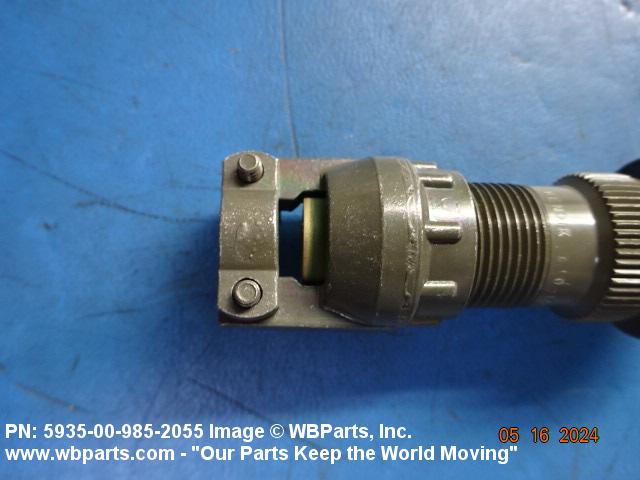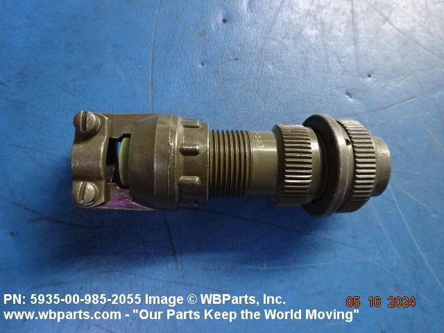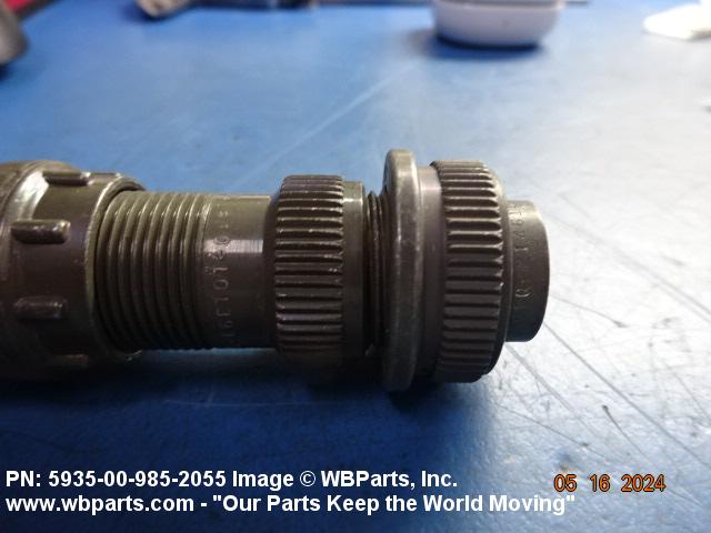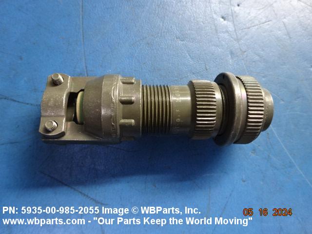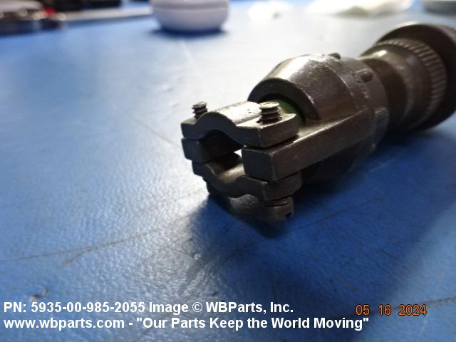 5935-00-985-2055 An electrical fitting with electrical contacts, constructed to be affixed to the end of a cable, conduit, coaxial line, cord or wiring for convenience in joining with other electrical connector(s) or PRINTED WIRING BOARD and is not designed to be mounted on a bulkhead, chasses, panel, PRINTED WIRING BOARD, or the like. Excludes JACK, TELEPHONE; JACK, TIP; PLUG, TELEPHONE; PLUG TIP; INSERT, ELECTRICAL CONNECTOR; CONNECTOR BODY (as modified); and SOCKET, PLUG-IN, ELECTRONIC COMPONENTS. See also LEAD ASSEMBLY, ELECTRICAL; WIRING HARNESS (as modified); and CABLE ASSEMBLY (as modified). For items without inserts, see SHELL, ELECTRICAL CONNECTOR.