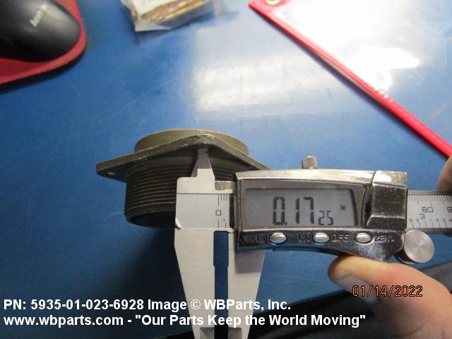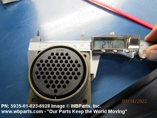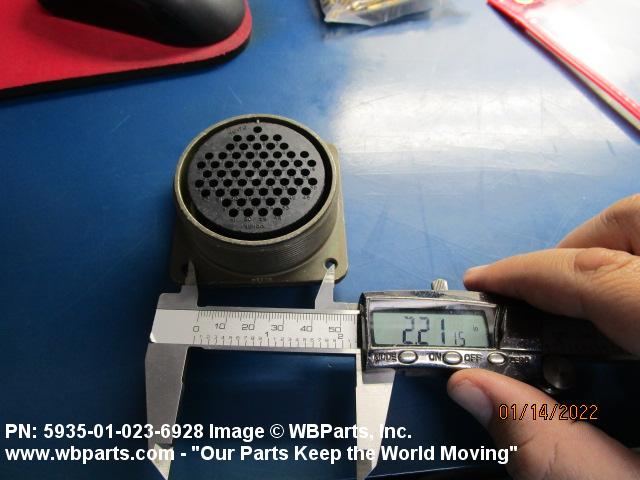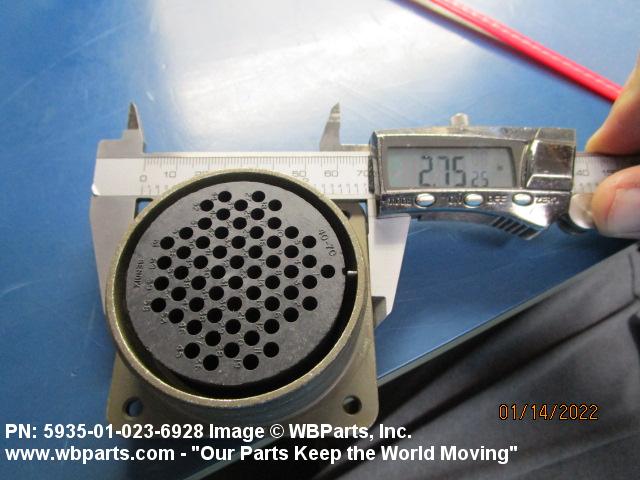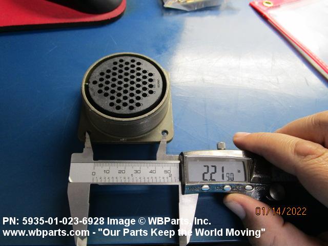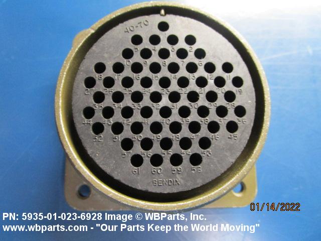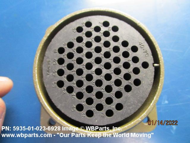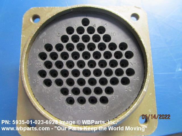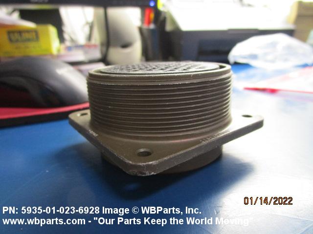 5935-01-023-6928 An electrical fitting with electrical contacts constructed to be affixed to the end of a cable, conduit, coaxial line, cord, wire (includes printed/etched), PRINTED WIRING BOARD, or the like for convenience in joining with another electrical connector(s) or PRINTED WIRING BOARD. It is designed to be mounted on a bulkhead, chassis, panel, wall, PRINTED WIRING BOARD, or the like. Excludes LAMPHOLDER; JACK, TELEPHONE; JACK, TIP; INSERT ELECTRICAL CONNECTOR; INSERT MODULE, ELECTRICAL CONNECTOR; CONNECTOR BODY (as modified) and SOCKET, PLUG-IN ELECTRONIC COMPONENTS. See also WIRING HARNESS (as modified) and CABLE ASSEMBLY (as modified). For items with termination wires of more than four inches in length, see LEAD ASSEMBLY, ELECTRICAL. For items without inserts, see SHELL, ELECTRICAL CONNECTOR.