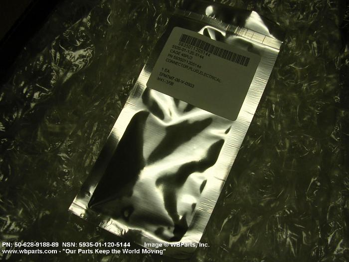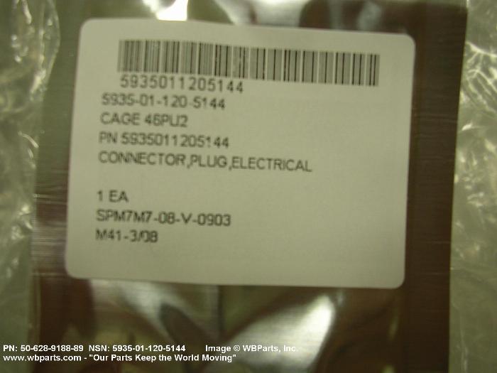 5935-01-120-5144 An electrical fitting with electrical contacts, constructed to be affixed to the end of a cable, conduit, coaxial line, cord or wiring for convenience in joining with other electrical connector(s) or PRINTED WIRING BOARD and is not designed to be mounted on a bulkhead, chasses, panel, PRINTED WIRING BOARD, or the like. Excludes JACK, TELEPHONE; JACK, TIP; PLUG, TELEPHONE; PLUG TIP; INSERT, ELECTRICAL CONNECTOR; CONNECTOR BODY (as modified); and SOCKET, PLUG-IN, ELECTRONIC COMPONENTS. See also LEAD ASSEMBLY, ELECTRICAL; WIRING HARNESS (as modified); and CABLE ASSEMBLY (as modified). For items without inserts, see SHELL, ELECTRICAL CONNECTOR.