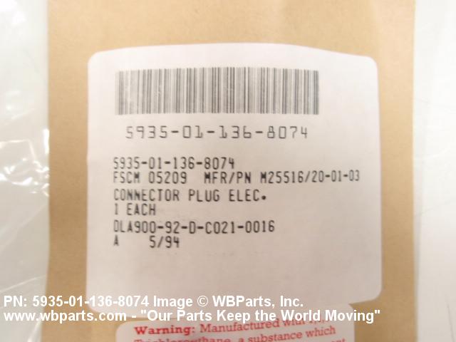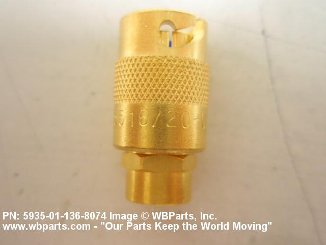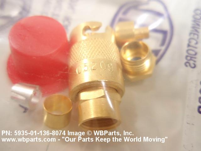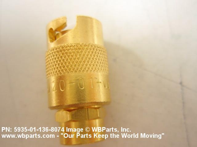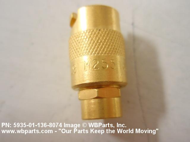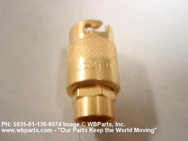 5935-01-136-8074 An electrical fitting with electrical contacts, constructed to be affixed to the end of a cable, conduit, coaxial line, cord or wiring for convenience in joining with other electrical connector(s) or PRINTED WIRING BOARD and is not designed to be mounted on a bulkhead, chasses, panel, PRINTED WIRING BOARD, or the like. Excludes JACK, TELEPHONE; JACK, TIP; PLUG, TELEPHONE; PLUG TIP; INSERT, ELECTRICAL CONNECTOR; CONNECTOR BODY (as modified); and SOCKET, PLUG-IN, ELECTRONIC COMPONENTS. See also LEAD ASSEMBLY, ELECTRICAL; WIRING HARNESS (as modified); and CABLE ASSEMBLY (as modified). For items without inserts, see SHELL, ELECTRICAL CONNECTOR.