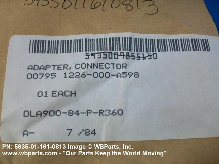 5935-01-161-0813 An adapter with electrical contacts which provides facilities for joining two or more electrical connectors, whose design or function will not normally warrant their junction. It is not designed for permanent attachment to a cable, cord, coaxial line, or wire. The physical shape of an electrical connector should not be the determining factor of its name. Tee, angle, straight, and Y-shaped adapters are all ADAPTER, CONNECTOR. Excludes ADAPTER, CONNECTOR TO LAMPBASE; ADAPTER, LAMPHOLDER TO CONNECTOR; ADAPTER (1), CABLE CLAMP TO CONNECTOR; and ADAPTER, LAMPHOLDER. For items designed as a mechanical connection between an electrical conduit and an electrical connector, see ADAPTER (1), ELECTRICAL CONDUIT.